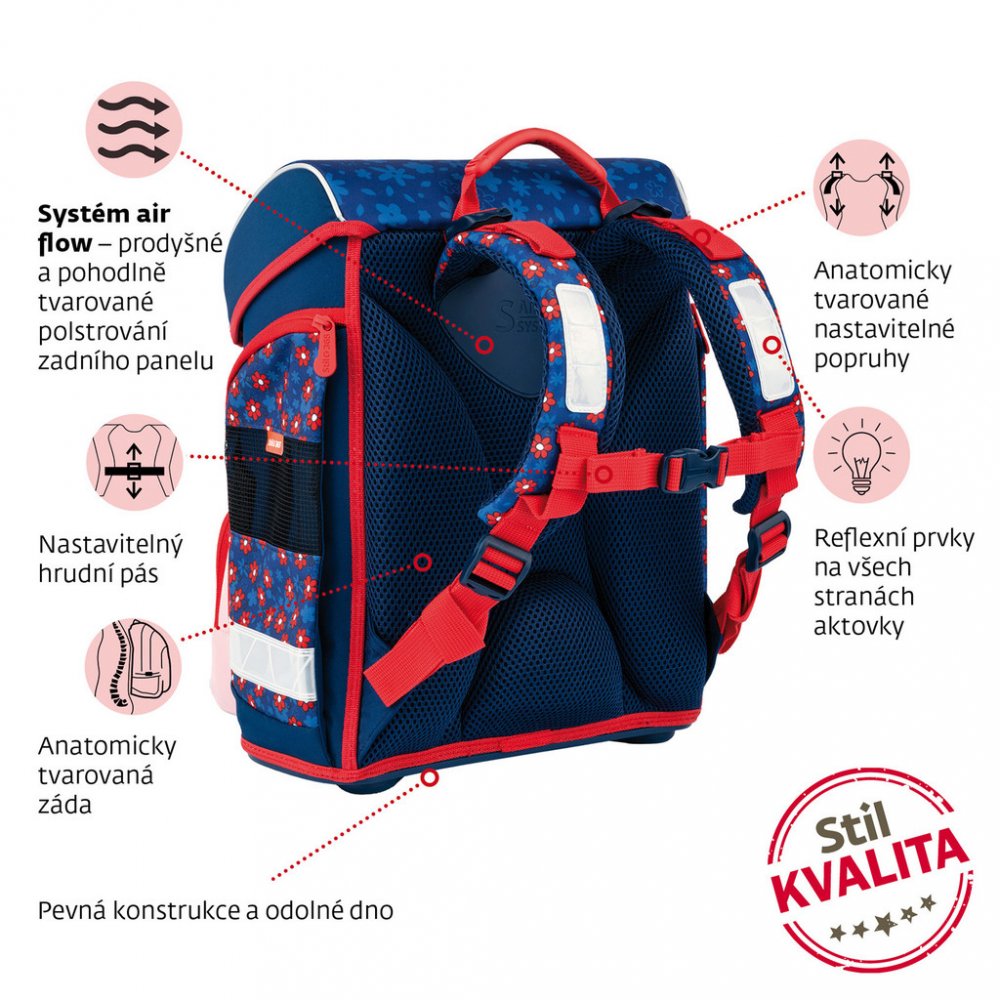 Kvalitní, ergonomická a velmi odolná školní aktovka je vybavena reflexními prvky a anatomicky tvarovanými zády s pevnou konstrukcí.