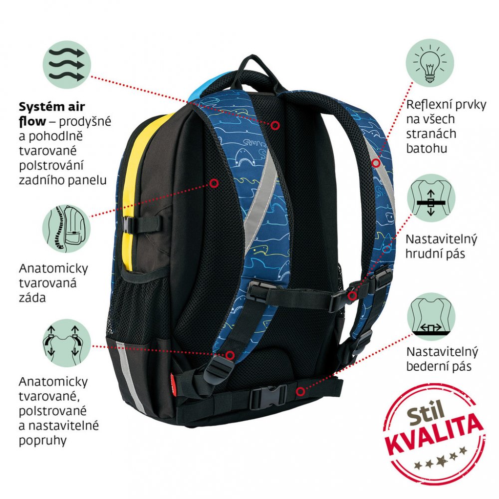 Kvalitní, ergonomicky tvarovaný odlehčený školní batoh Stil s anatomicky tvarovanými zády s Air Flow systémem.