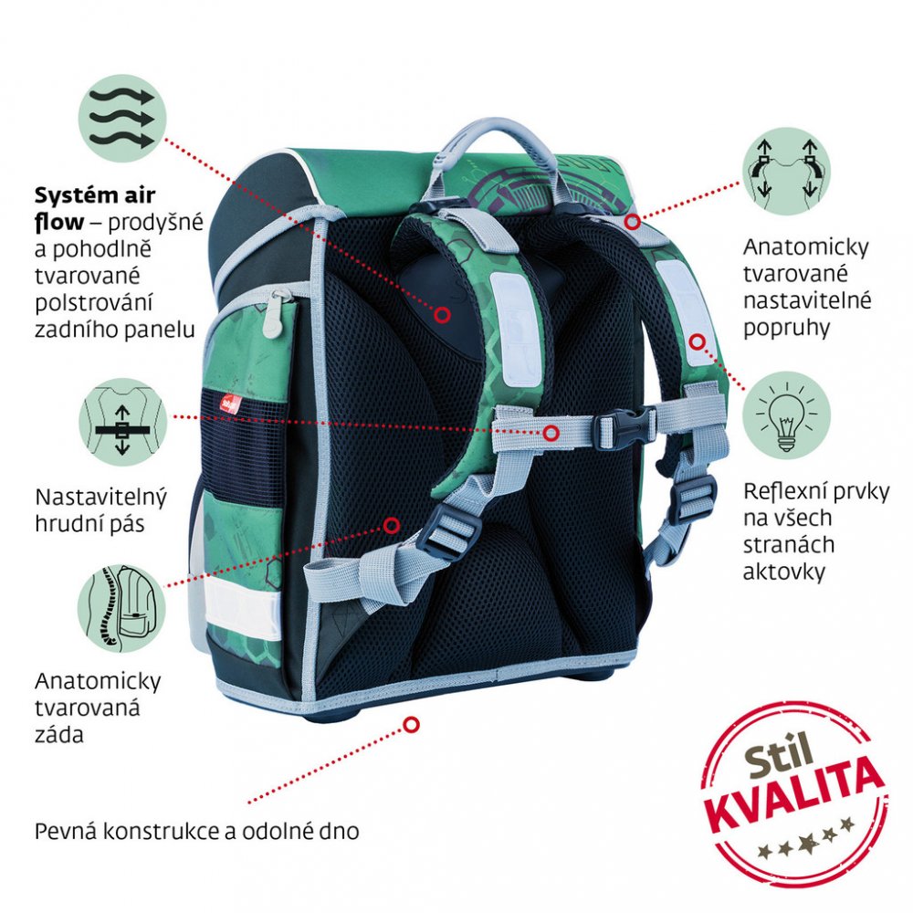 3D ZÁDOVÝ SYSTÉM - Aktovka do školy perfektně sedí na zádech. Anatomický zádový panel se přizpůsobí páteři dítěte a systém Air Flow a prodyšné polstrování umožní cirkulaci vzduchu a příjemné nošení. Hrudní pás s kvalitní přezkou zaji...