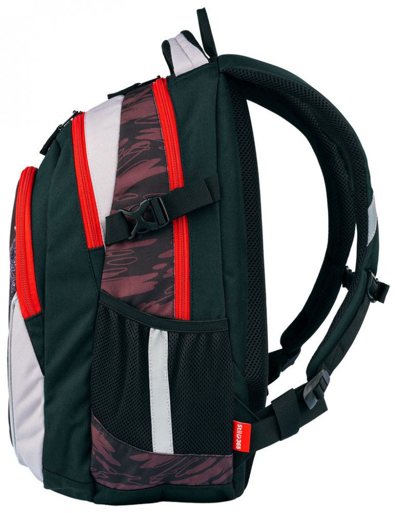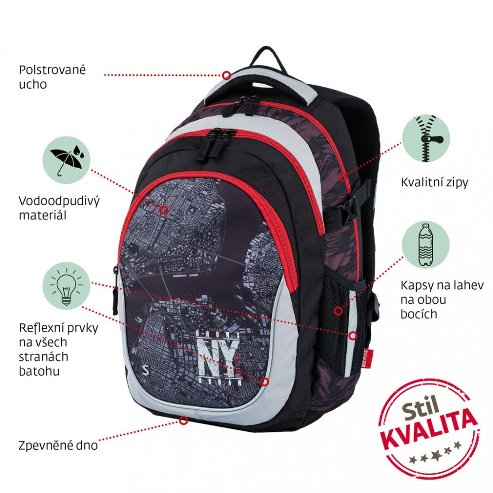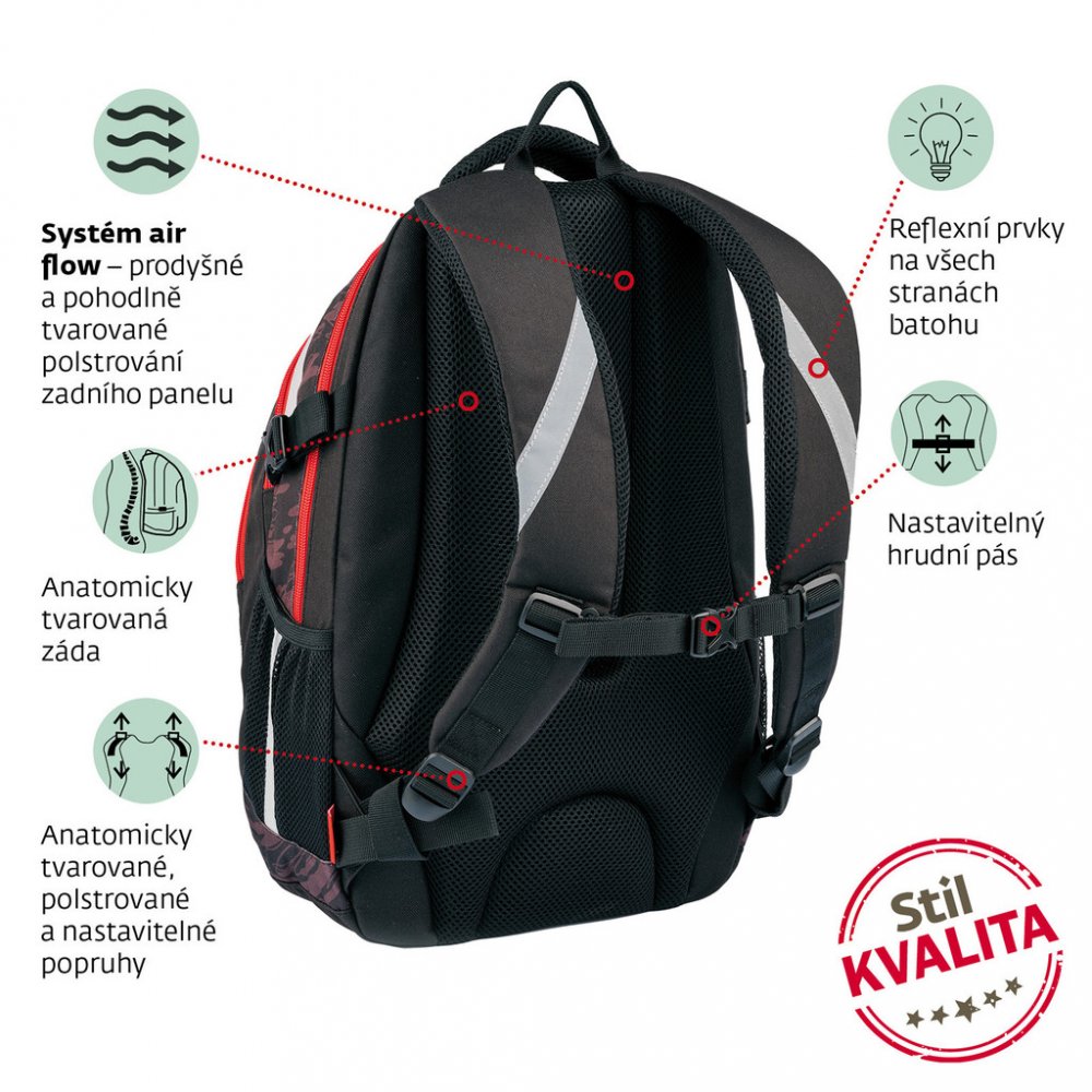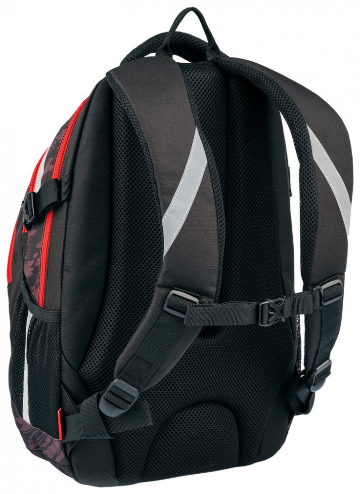 Kvalitní, ergonomicky tvarovaný odlehčený studentský batoh s 3D zádovým systémem. Polstrování je z prodyšného materiálu. Na bocích batohu jsou kapsy na láhev na pití. Skládá se ze 3 komor.