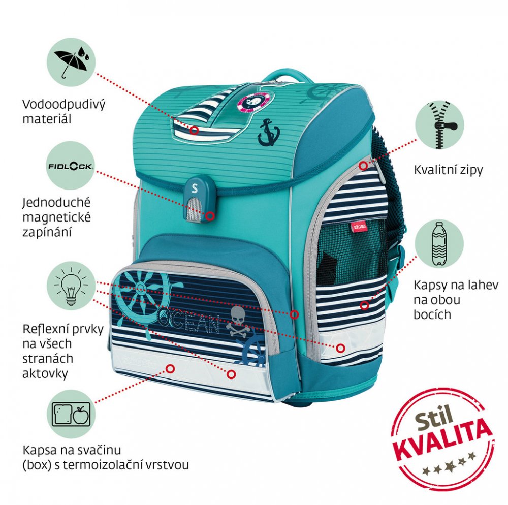 Aktovka je klíčovou součástí vybavení každého školáka. Nejen, že bude dělat parádu vašemu potomkovi po celý rok, ale rovněž podporuje dobré držení těla. Aktovka do školy Stil vyniká jak pěkným designem, tak nadprůměrně kvalitním vyhotovením. Její hmotnost je 1 kg, je tak velice lehká a snižuje celkovou zátěž pro dítě. Zároveň je značně pevná a zvládne unést až 7 kg. Její anatomicky tvarovaná záda a anatomicky tvarované popruhy garantují, že bude komfortně sedět na zádech a bude se velice příjemně nosit. Dominuje jí zelená barva. Hlavní přednosti produktu Stil školní aktovka Ocean Pirate Aktovka Stil slouží ke snadnému transportu učebnic a sešitů Její hmotnost je 1 kg Aktovka do školy vyniká nosností až 7 kg Anatomicky tvarovaná záda a anatomicky tvarované popruhy zajistí pohodlné nošení Vyztužená záda poskytují dobrou oporu Obsahuje reflexní prvky, jež zlepšují bezpečnost při cestě do školy Výrobním materiálem aktovky do školy Stil je polyester V aktovce se nachází přední kapsa, boční kapsy a vnitřní kapsy...