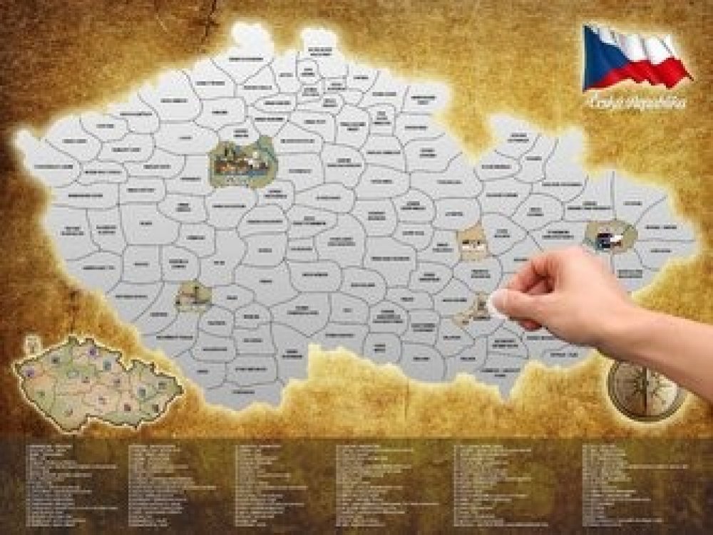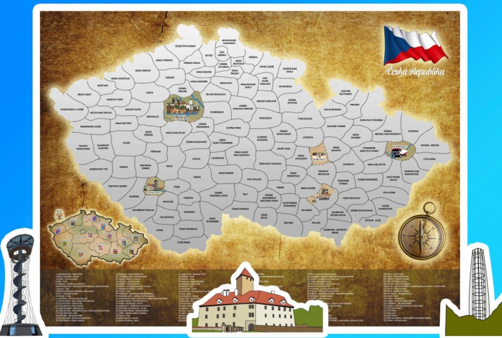 Cestování je oblíbenou aktivitou řady z nás - rádi objevujeme nová místa a vracíme se na ta, kde se nám líbilo. Naše republika nabízí hodně takových nádherných a zajímavých míst, je přímo stvořená pro prázdninové putování nebo víkendové výlety a poznávání historických památek, přírodních útvarů a mnoha dalších pamětihodností. Rozměr mapy: 80 x 60 cm S originální stírací mapou bude cestování po českých zajímavostech ještě zábavnější. Nabízí vám 120 tipů na výlet do nejzajímavějších míst naší vlasti, kde pokaždé najdete něco nezapomenutelného: hrady, zámky, úžasné přírodní lokality či kulturní památky. Mapa bude zabalena do ozdobného tubusu, který může sloužit jako dárkové balení. Naplánujte si výlet (například na hrad Křivoklát), a když se z něj vrátíte, setřete příslušné políčko. A znovu si naplánujte výlet… Za jak dlouho budete mít celou mapu setřenou? Kolik měsíců budete potřebovat na objevení všech 120 míst naší země? Tato krásná mapa je zároveň skvělou dekorací, která vám bude stále připomínat vaše rodinné výlety a společně prožité chvíle. Každé místo na mapě je velmi pěkně a do detailu vykreslené, a celé její zpracování je opravdu exkluzivní.