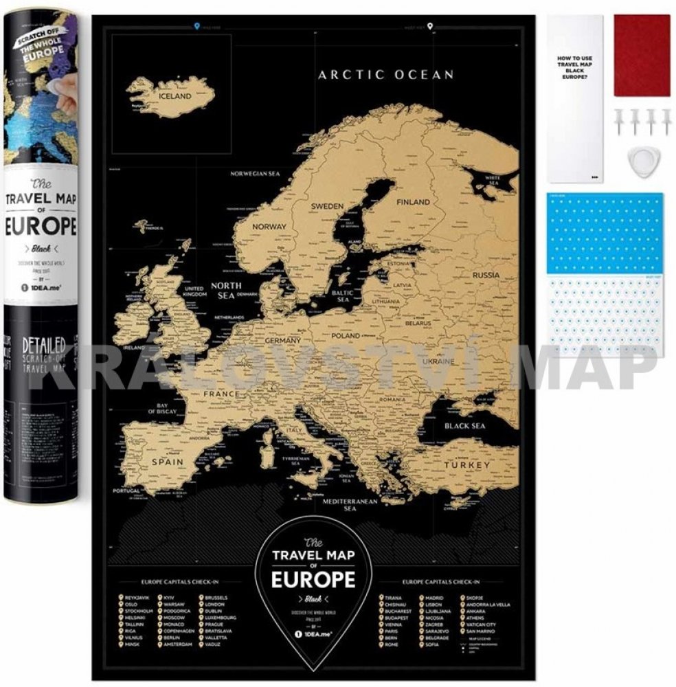 Stírací mapa Evropy Travel Map Europe Black - Mapa, hliníkový rám - černá barva