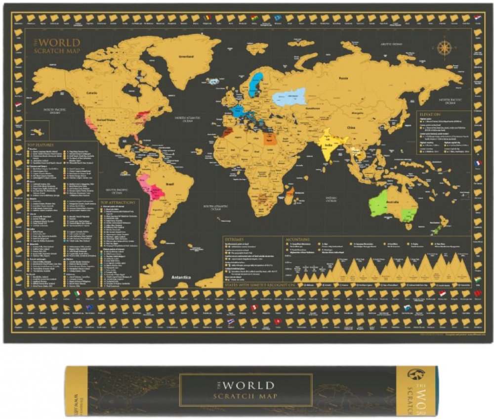Po setření zlaté fólie se odhalí barevně rozlišené oblasti. Ty vám pomohou nejen lépe si představit geografické rozdělení světa, ale také plánovat své další výlety po státech.