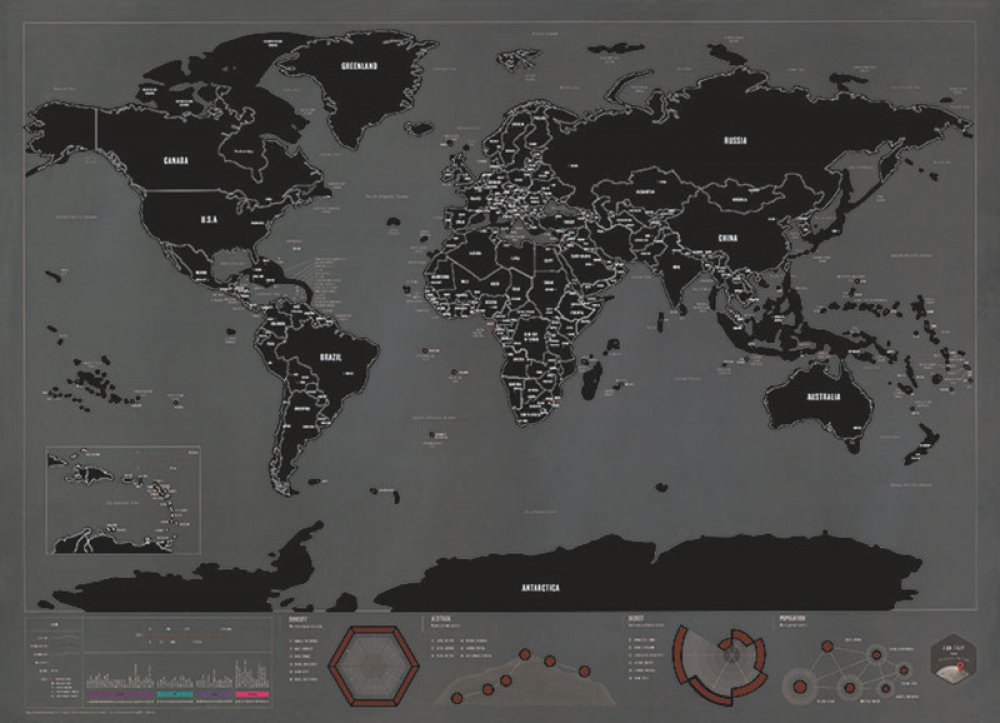 Stírací mapa světa Black Elegantní mapa pokrytá černou fólií. Nadstandardní velký rozměr, který jistě zkrášlí každý interiér nebo kancelář. Novinka extravagantní černá barva Stříkací mapa - Objevte svět s přehledem a stylem Představujeme Vám Stříkací mapu – jedinečný, elegantní a zároveň praktický způsob, jak mít celý svět na dosah ruky. Tento dokonale navržený produkt je ideálním dárkem pro cesto...