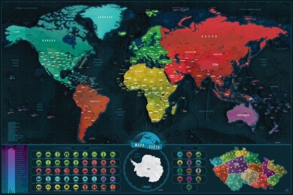 Stírací mapa světa Deluxe XL je jako stvořená pro vášnivé cestovatele. Setřete místa které jste již navštívili a plánujte další dovolené v české verzi stírací mapy světa Mapa je vyrobena ze dvou vrstev. Horní je z fólie, kterou můžete seškrábat mincí nebo kartou čímž se odhalí spodní vrstva jiné barvy a tak bude pěkně vidět, kde jste již byli. Navštívené místa si na naší mapě jednoduše setřete, jako los. Spodní vrstva mapy je barevná, barvy odpovídají jednotlivým památkám. Povrch mapy je pokryt luxusní stírací vrtsvou zlaté barvy, která působí příjemně a luxusně. Mapa může být motivaci pro cestování a spoznávání jednotlivých míst. Každá mapa je zabalena v designovém tubusu, který mapu chrání před poškozením a řeší problém, jak dárek zabalit. Stírací mapa lze použít jako originální dárek. Specifikace produktu: Deluxe verze s vytištěným reliéfem planetyV provedení tmavomodrá / zlatáXL rozměr 90x60cmLuxusní povrchová úprava mapy (lesklé lamino + stírací fólie zlaté barvy)Detailnější vykreslení mapy - až 800 popisků45 světových památek na stíráníČeská verze obsahuje také pestrou mapu Česka rozdělenou na okresyČeské památky z krajských měst na setřeníVýškový rekord obsahujíci Sněžku a jiné vrchy z okolí ČeskaBalené v pevné tubě aby se mapa nepoškodila.