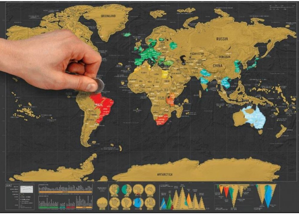 Představujeme Vám stírací mapu světa deluxe černá, ideální dárek ne jen pro ty, co rádi cestují, ale i pro ty, co by rádi cestovali. Scratch map je speciální mapa světa, která je pokryta stírací hliníkovou fólií. Stačí hrubším předmětem setřít tuto zlatavou barvu, jako při stírání losu, a objeví se barevné zobrazení států. Takto si můžete na mapě označovat místa, která jste navštívili, místa, která byste navštívit chtěli, a nebo místa o kterých se zrovna učíte ve škole. Odhalíte velké množství faktů a informací o zemi a oceánech. Udělejte tímto dárkem radost ne jen sobě, ale i těm, kteří chtějí objevovat svět. Stírací mapa světa deluxe černá je originální dárek pro každého.