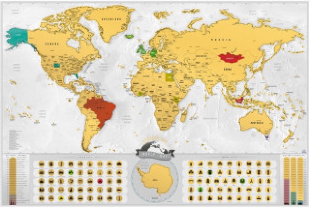Stírací mapa světa - cz, zlatá Deluxe XXL Mapa je vyrobena ze dvou vrstev. Horní je ze stírací fólie, kterou můžete seškrábat mincí nebo kartou čímž se odhalí spodní vrstva jiné barvy a tak bude pěkně vidět, kde jste již byli.