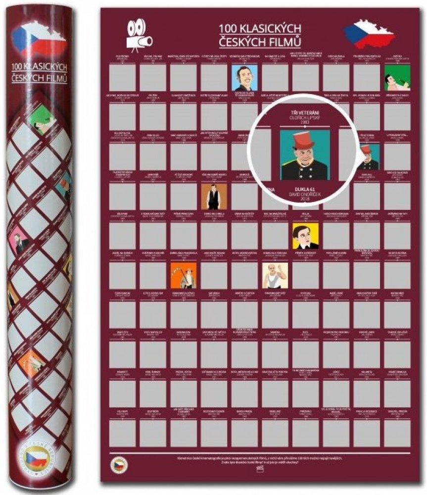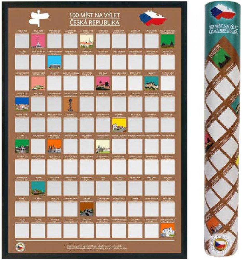 jedinečný stírací plakát České republiky obsahující 100 detailně vykreslených památek, měst a zajímavých míst z naší malebné země uložený v dárkovém kartonovém tubusu s polepem