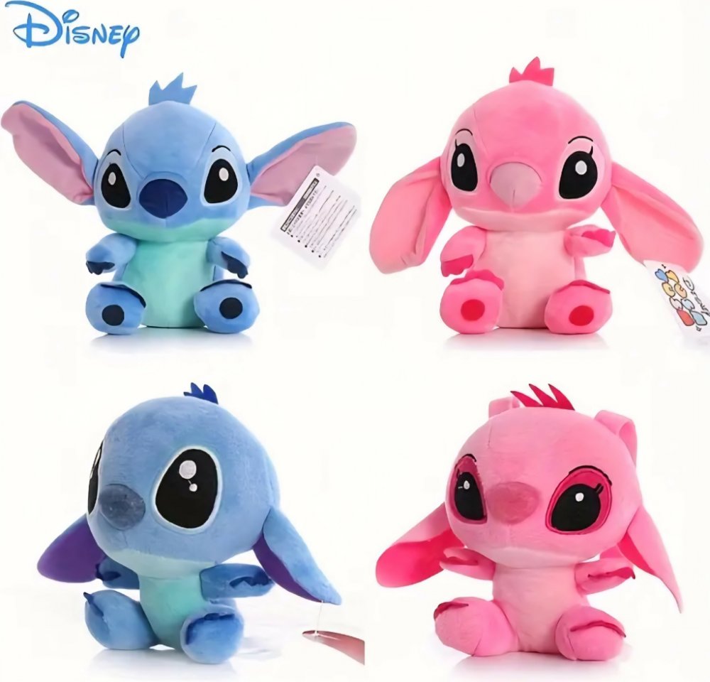 Plyšák Stitch: Tento plyšák představuje oblíbenou postavičku Stitche (Experiment 626) z animovaného filmu Lilo & Stitch. Je vyroben z měkkého, světle modrého plyše, s tyrkysovými detaily na bříšku a kolem očí. Má charakteristicky velkou hlavu, obrovské černé oči, které mu dodávají nevinný výraz, a velké, ohebné uši s typickými zářezy. Plyšák sedí v roztomilé póze.