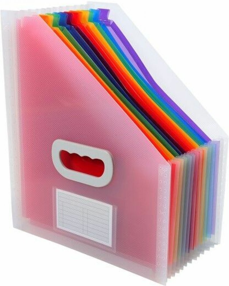 Exacompta Crystal - stojan na časopisy 12 kapes, A4 maxi, PP, 265 x 325 x 110 mm Velkoobjemový stojan pro dokonalou organizaci a uložení časopisů nebo dokumentů. Vnitřek rozdělen barevnými záložkami na samostatné sekce. Obsah tak lze třídit dle abecedního nebo číselného pořadí. Široké otevření pro snadné zakládání. Kombinovatelné s dalšími výrobky řady Crystal. Parametry: pro formát A4 maxi rozměry: 265 x 325 x 110 mm materiál: průhledný PP 1 mm, barevné přihrádky PP 0,2 mm kapsa na boku s popisovatelnou kartou prostor k umístění štítků zpevněné rukojeti pro snadné přenášení omyvatelné balení: 1 ks
