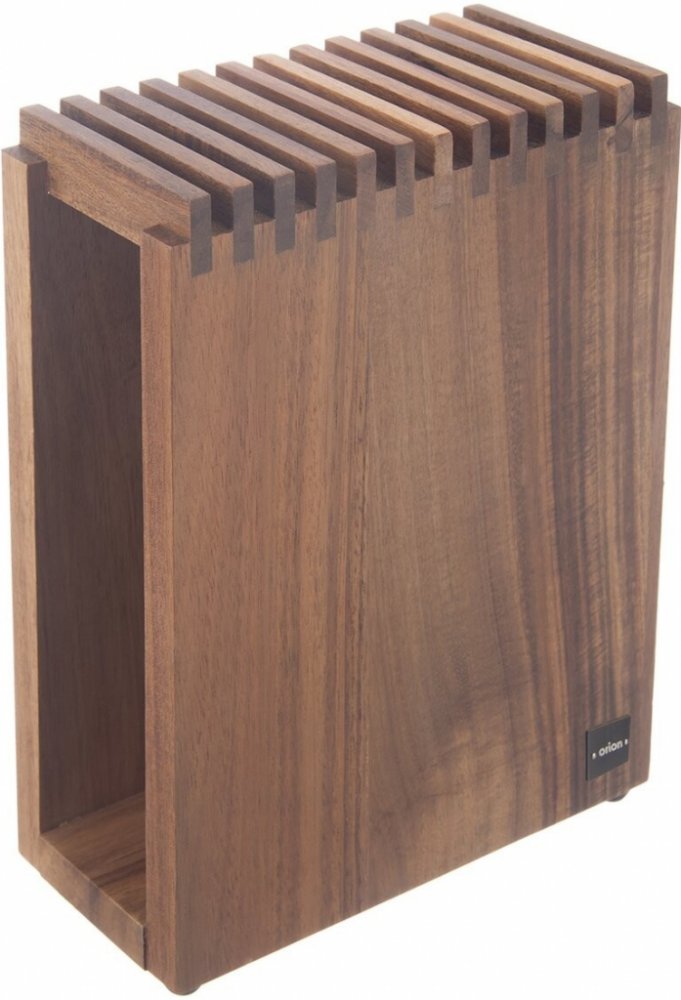 Praktickým řešením k uložení ostrých kuchyňských nožů je stojan na nože. V tomto stabilním stojanu z ořechového dřeva lze uložit nože, ať už jde o malé nože na zeleninu nebo velké santoku nože se širším ostřím. Každý nůž stačí vsunout do drážky v horní části, takže se nebudou o sebe třít, nedojde k tupení a poškození ostří.