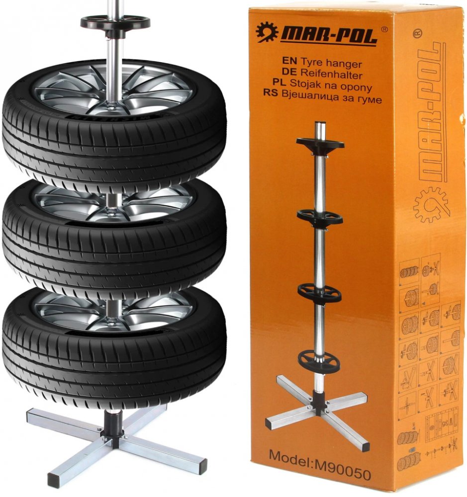 Stojan pojme až 4 kola o šířce max. 235 mm. V případě menšího počtu kol se úměrně zvětší max. šířka pneumatiky. Nastavitelné držáky / rozpěrky lze odstranit, aby se zvýšila maximální šířka pneumatiky. Stojan stojí pevně na čtyřbodové základně. Je lehký, praktický a snadno se pohybuje.
