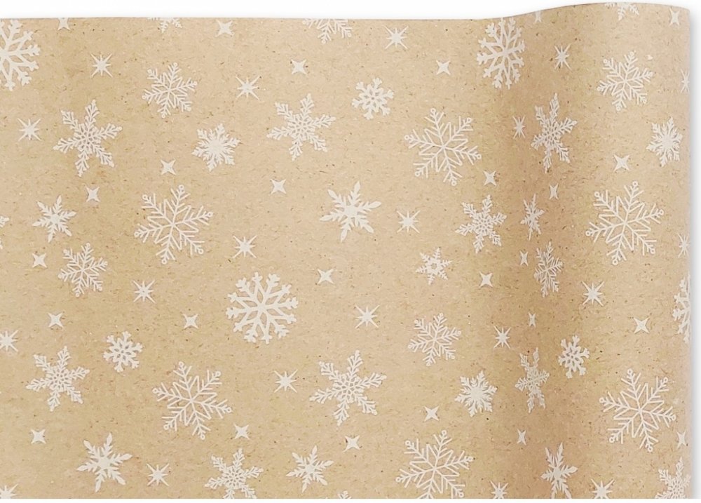 Přírodní vzhled v kombinaci s bílým potiskem vytváří moderní a stylový efekt, který dodá vašim dárkům originální vzhled. Klíčové vlastnosti: Rozměry: Šířka 70 cm, délka 2 m Vzor: Bílý potisk vloček na přírodním podkladu