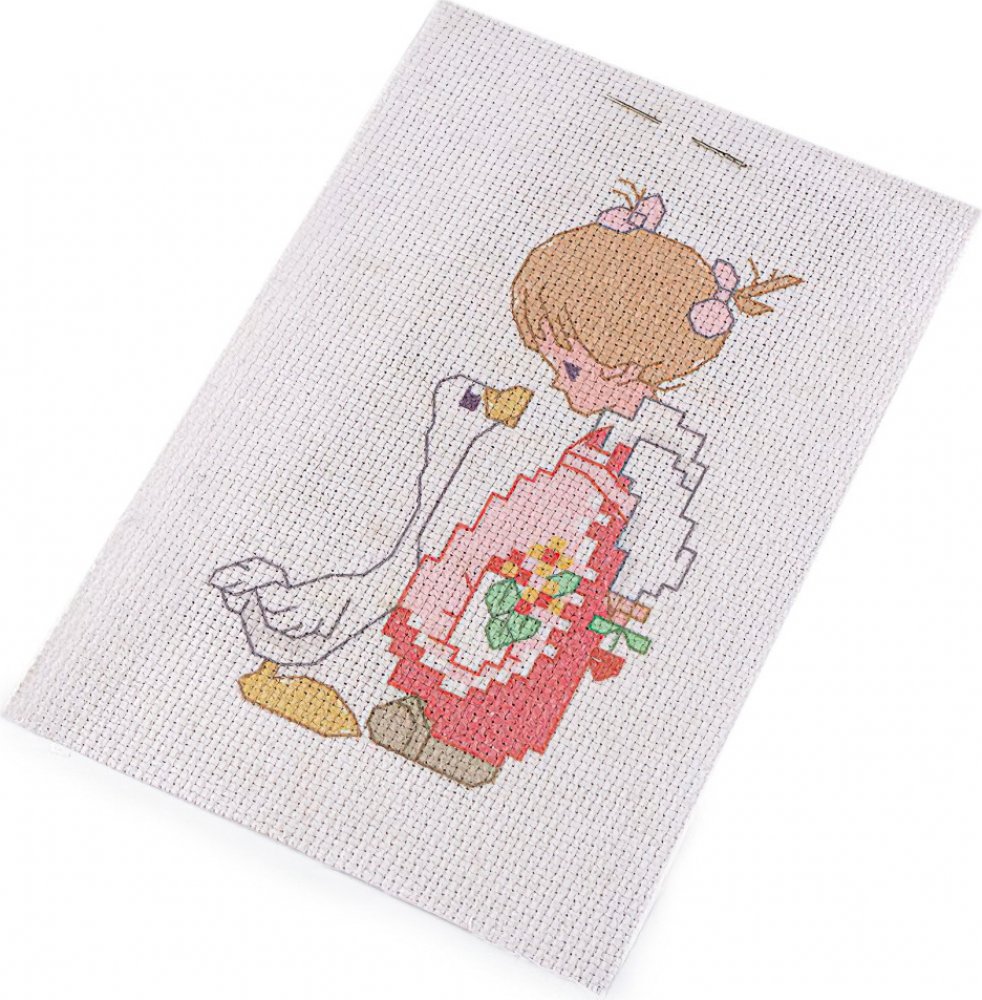 Dětská sada na vyšívání s motivem holčičky a husy. Vyšívá se na předtištěnou tkaninu ze 100% bavlny pomocí přiložené sady nití, nejlepší je však použít příze mouline (mulinka), které nejlépe vyniknou. Vyšívací sada obsahuje vyšívací tkaninu s předlohou, sadu barevných nití a jehlu. Rozměr celého plátna je 14 x 20 cm.
