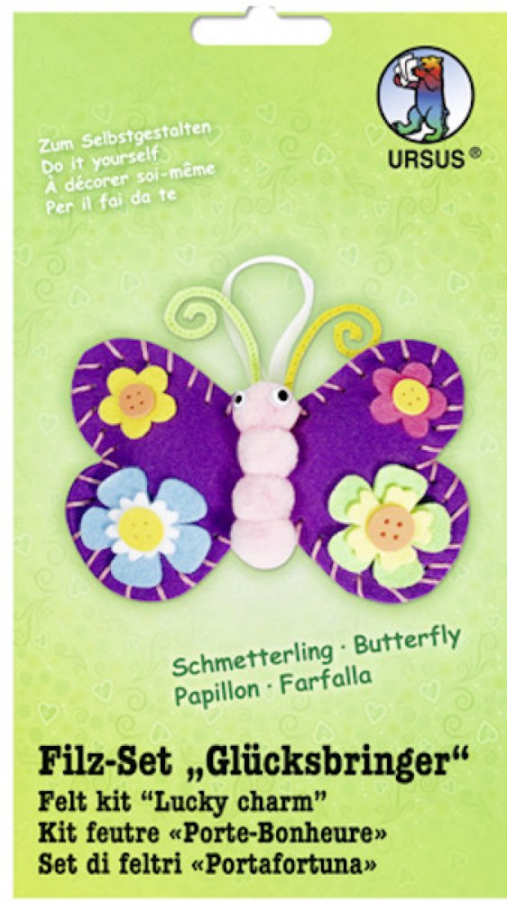 Sada na výrobu motýlka. Rozměry 12,5 x 10,5cm. Obsahuje filcové výřezy, plastovou jehlu, nit, dekorační oči, stuhu, bambulky, pěnovku, výplň a chlupaté drátky. Vše na výrobu 1ks motýlka. Nevhodné pro děti do 5ti let.