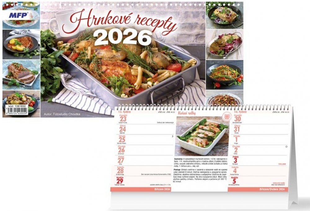 Stolní kalendář na rok 2026 s názvem Hrnkové recepty. Každý týden Vás potěší jeden recept na chutný pokrm. Vhodný na zapisování důležitých poznámek, k organizování různých událostí každodenního života. Možnost dotisku firemního loga a textu na spodní stranu kalendáře.