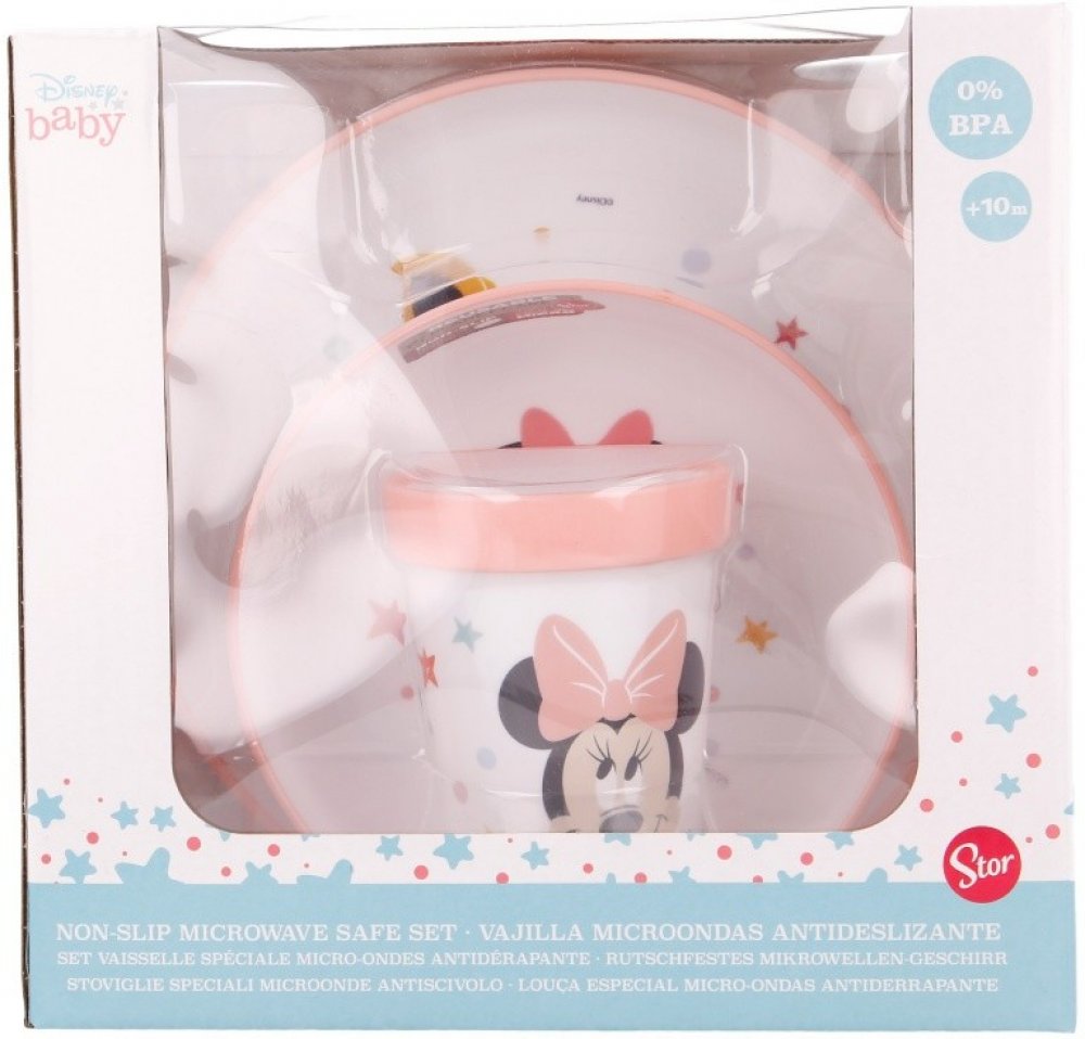 Plastová sada nádobí pro děti od 10 měsíců. Souprava obsahuje misku, talíř a pohár. Díky pestrým barvám a veselým motivem bude jedení zábavou! Vhodné pro použití v mikrovlnné troubě. Dárkové balení.Plastová jídelní souprava MINNIE MOUSE • licenční výrobek, vhodná pro děti, odolný plast • mělký talíř průměr 20cm, miska průměr 14,5cm, pohár objem 260ml • BPA free, vhodná do mikrovlnné trouby, • výrobce: STOR, Španělsko