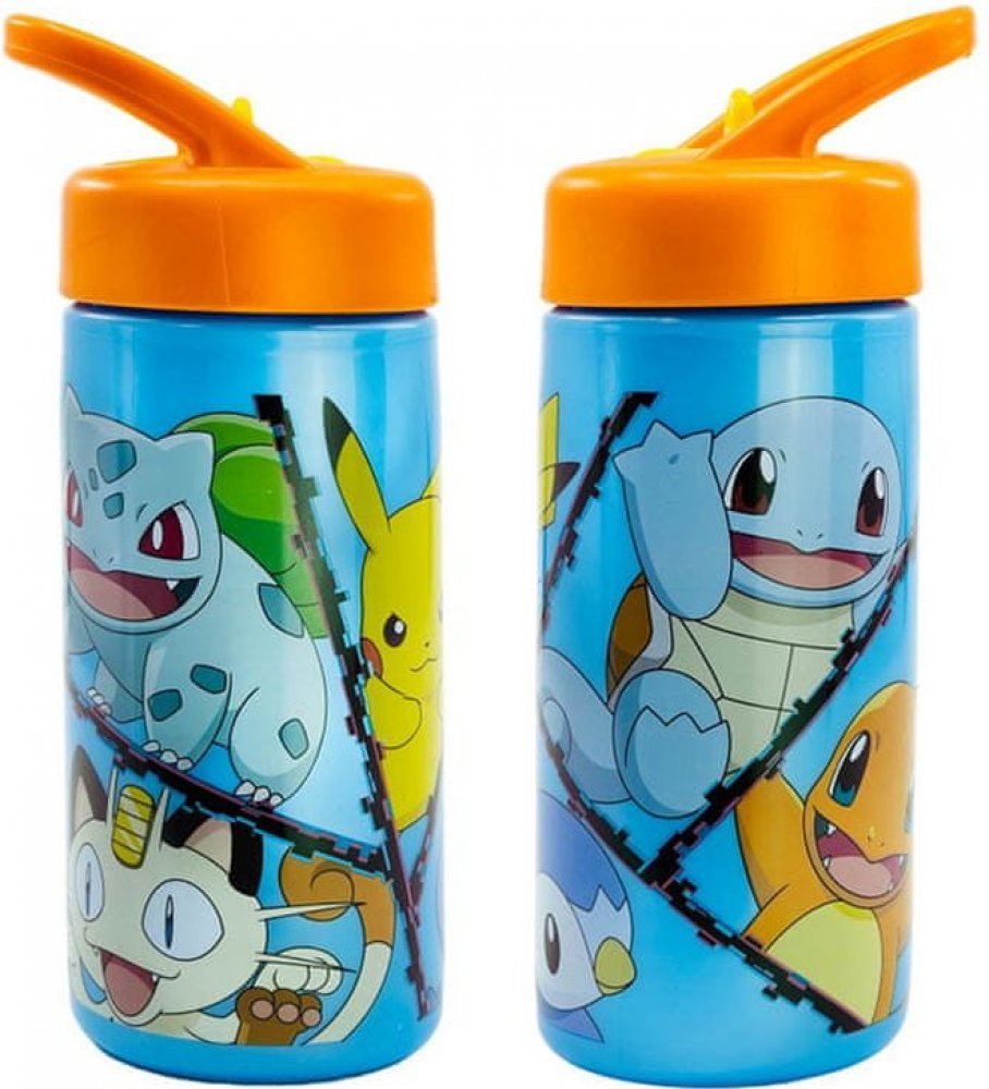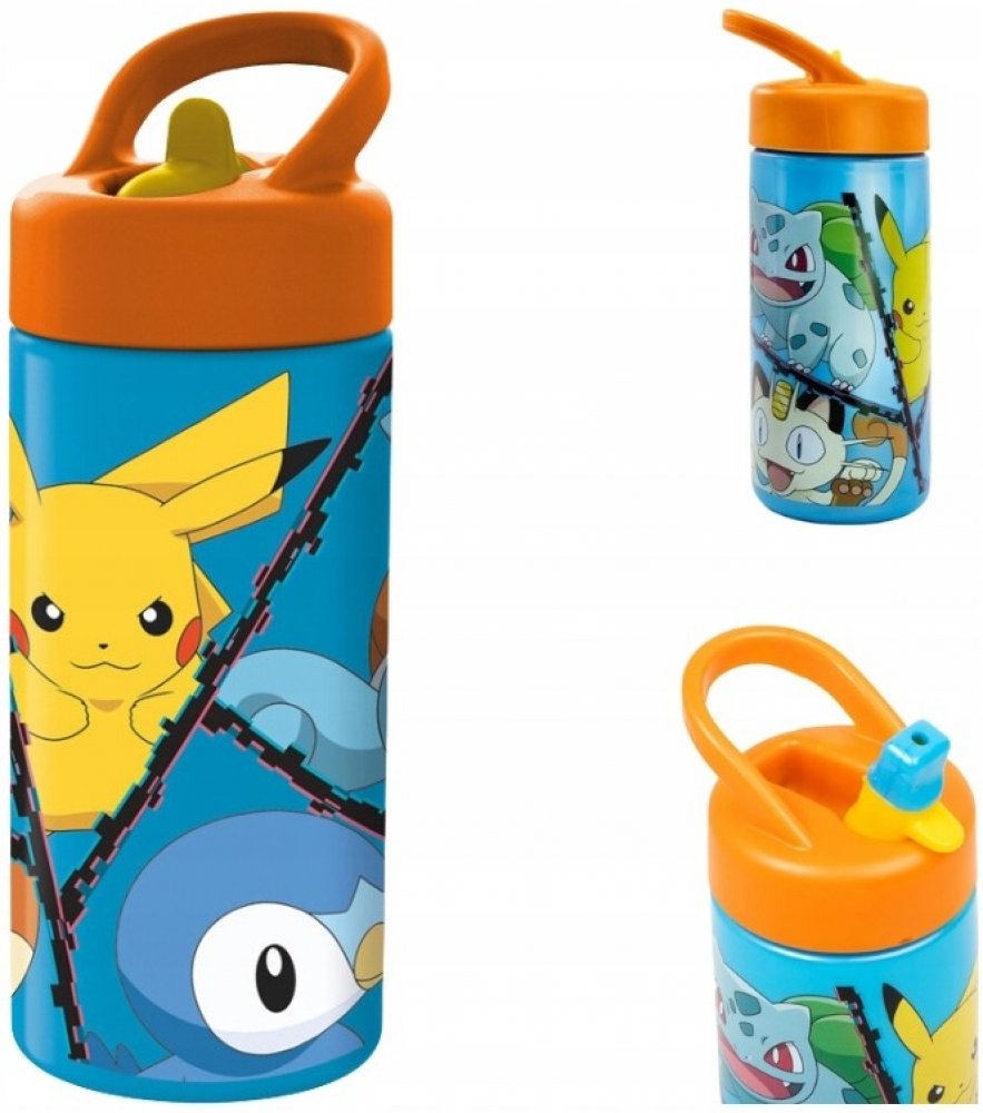 Láhev na pití s víčkem s pítkem s grafikou a barev hlavních pokémonů jménem Pikachu, Charmander a další, od společnosti Pokémon. Láhev je vhodná pro všechny menší i větší fanoušky.