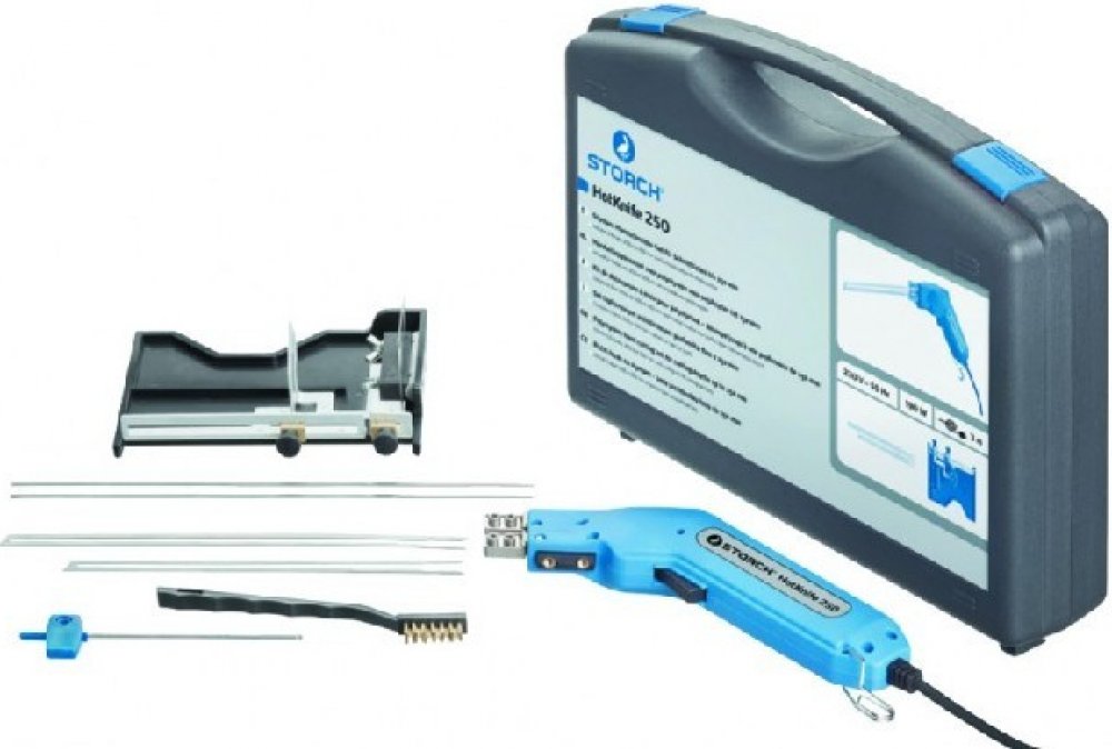 Řezací čepele 200 a 250 mm, profilový řezač, 2 flexibilní řezací čepele 300 mm pro profilový řezač, montážní klíč, mosazný drátěný kartáč a praktický plastový transportní kufr.