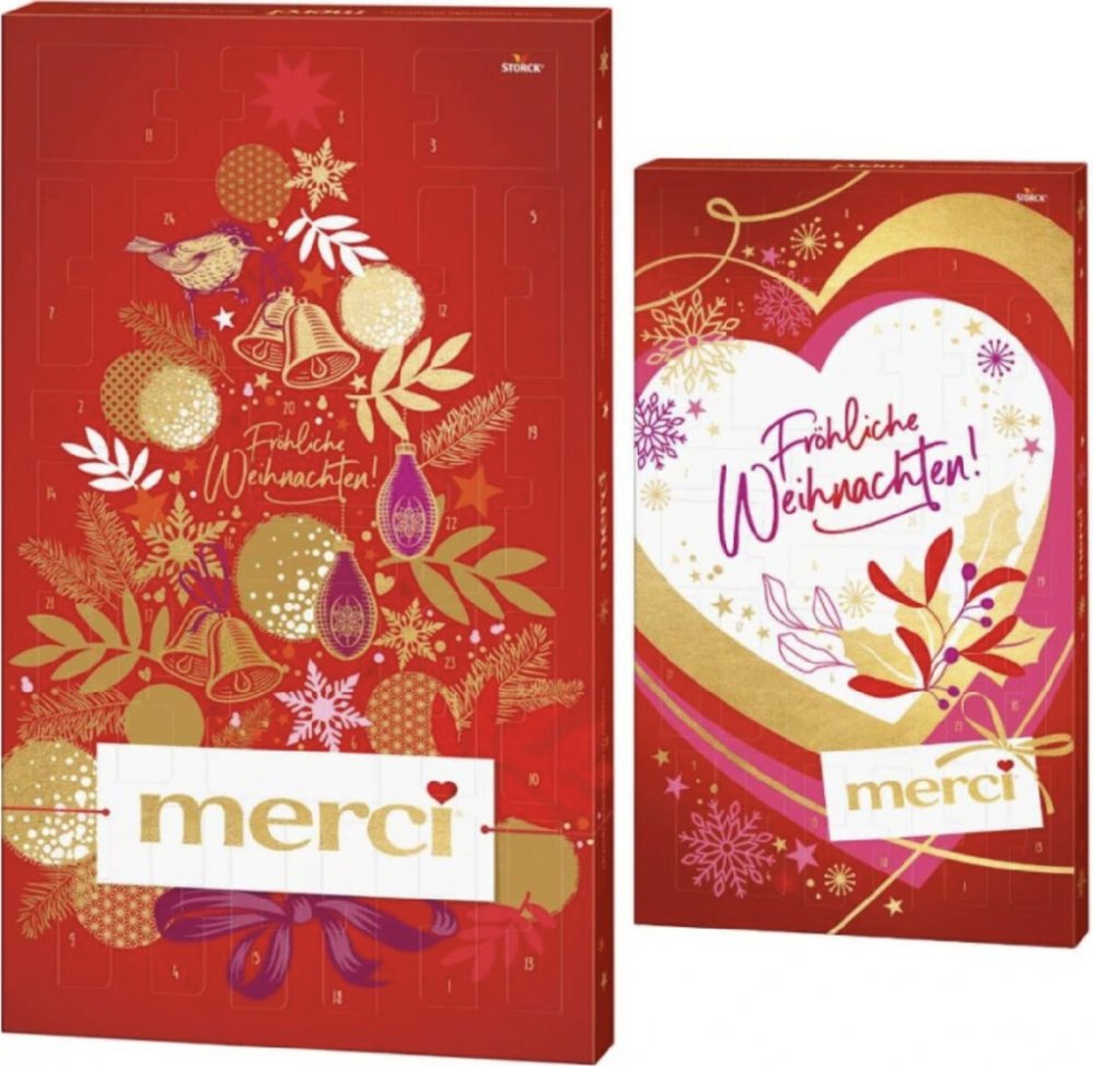 Tento adventní kalendář má velikost přibližně 28,5 × 48,5 cm a obsahuje následující speciality: Merci Finest Selection: plněné a neplněné čokoládové speciality Merci Petits: plněné a neplněné čokoládové maličkosti Merci Crocant: křehké pralinky s jemnou mléčnou čokoládou Merci Hearts: Jemně tající čokoládové srdce Merci Merry Christmas Balls: Jemně tající čokoládové kuličky