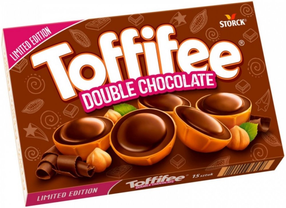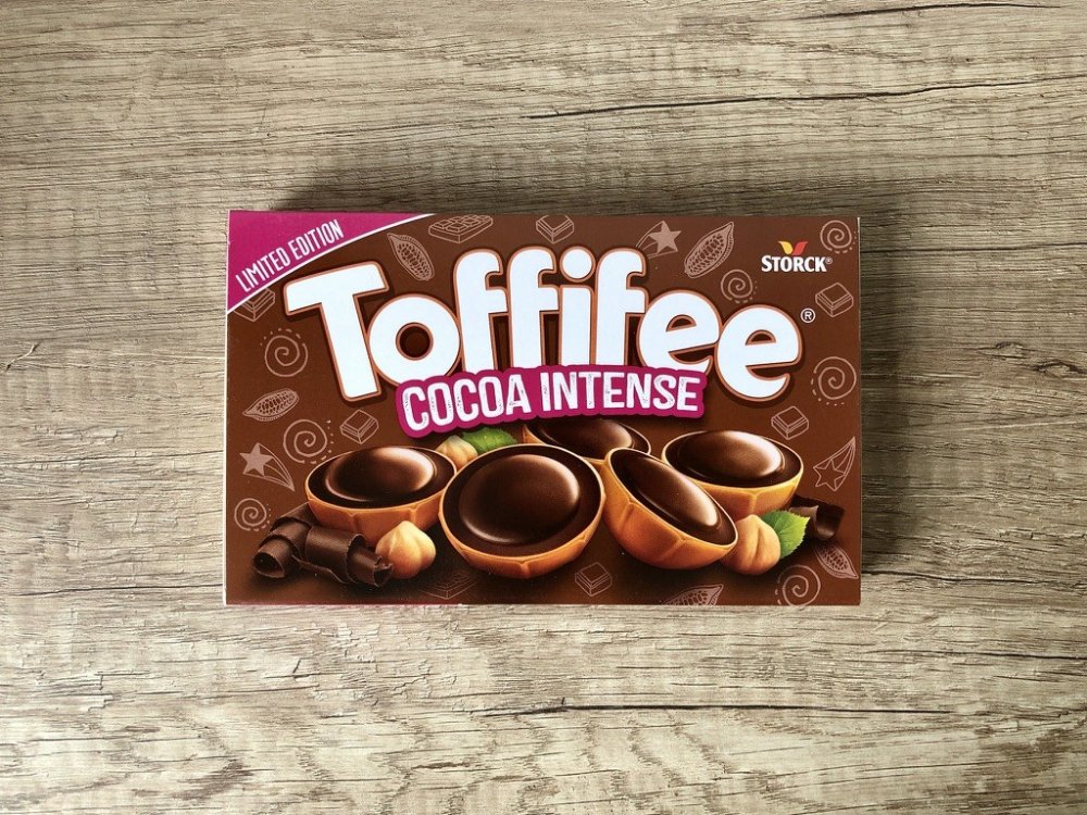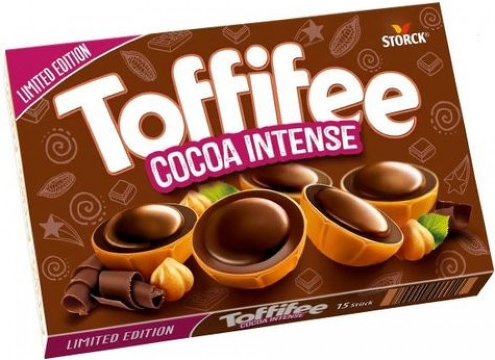 Limitovaná edice Toffifee Cocoa Intense, celé jádro lískového oříšku v karamelu s kakaovo-lískoořechovým krémem a čokoládou.