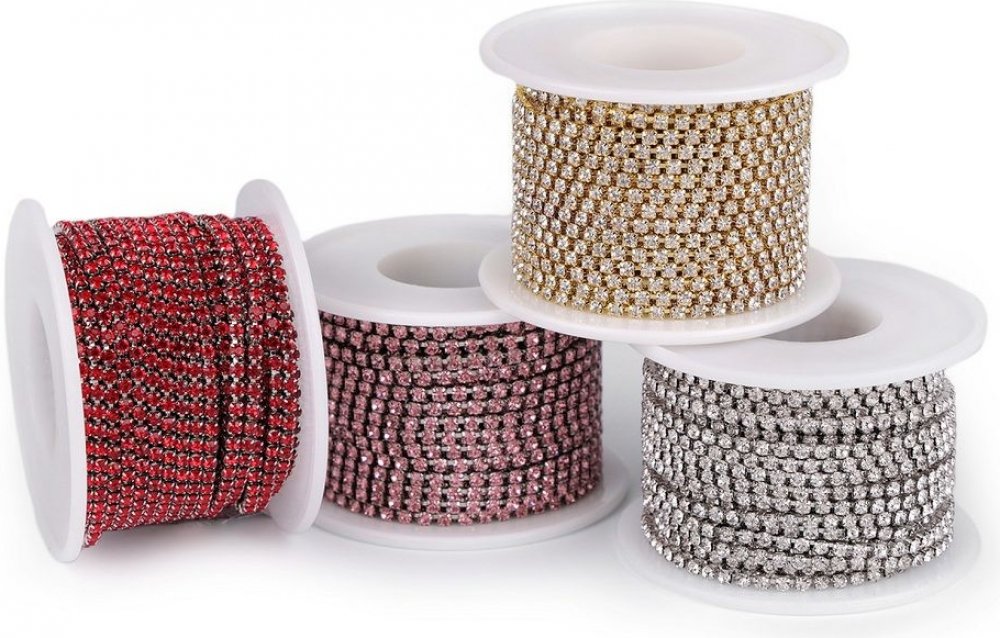 Luxusní bižuterní řetízkovou bortu zdobí třpytivé kamínky, které jsou vsazené do kovových plíšků.