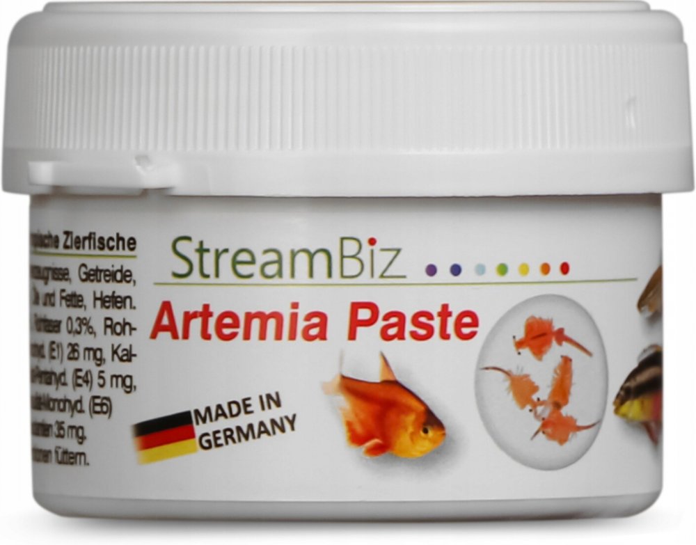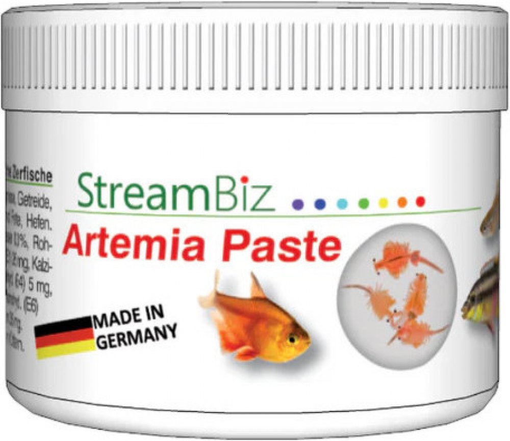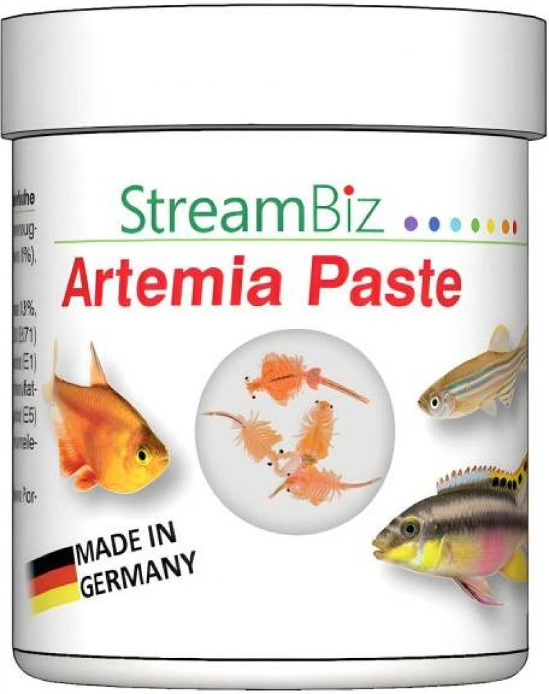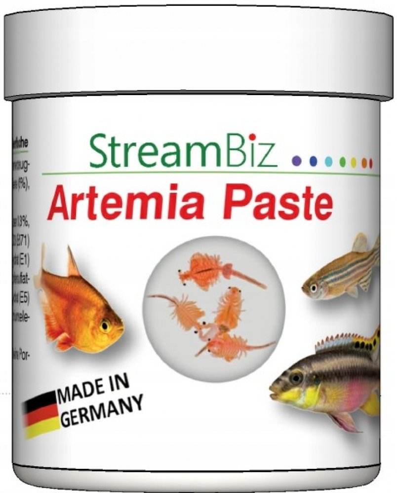 Žábronožka solná v pastě s vitamíny Artemie je drobný korýš, který Vašim živočichům dodá potřebné bílkoviny, zdravé tuky společně s cennými mastnými kyselinami omega 3-9 a potřebné minerály, pro vitální růst a atraktivní zbarvení. Hlavní přednosti StreamBiz Žábronožka solná nejvyšší kvality Svěží a šetrné zpracování S cennými omega-3 a omega-6 mastnými kyselinami Obohacené o vitamíny a stopové prvky Bez mikrobů podle mikrobiologických a bakteriologických testů Vhodné i do mořské vody Proč Pasty StreamBiz? Ať už to jsou granule nebo vločky jak Vás tak i Vaše ryby to po nějakém čase omrzí Pasty StreamBiz nabízí originální přísun krmiva, jednoduše krmivo nalepíte, kamkoliv do akvária a aramo okamžitě přiláká všechny živočichy z akvária na úžasné hody. Dopřejte Vašim rybám to, co doopravdy chtějí a krmte krmivy StreamBiz Pure Nature! Složení: Ryby a rybí vedlejší produkty, obiloviny, zelenina, měkkýši a artemie, oleje a tuky, kvasnice. Aditiva / kg Vitamin D3 (E671) 450 IU, stopový prvek: síran železnatý monohydrát (E1) 26 mg, jodičnan vápenatý bezvodý (E2) 1 mg, síran měďnatý pentahydrát (E4) 5 mg, síran manganatý monohydrát (E5) 10 mg, síran zinečnatý ( E6) 66 mg, seleničitan sodný (E8) 0,03 mg Antioxidant: 35 mg Nutriční hodnoty: Hrubý protein 36 %, hrubý tuk 9 %, hrubá vláknina 0,3 %, hrubý popel 5 % Návod: Krmivo lze použít jako doplňkové nebo kompletní krmivo. Krmte toto jídlo v malých porcích denně. Vyrobeno v Německu