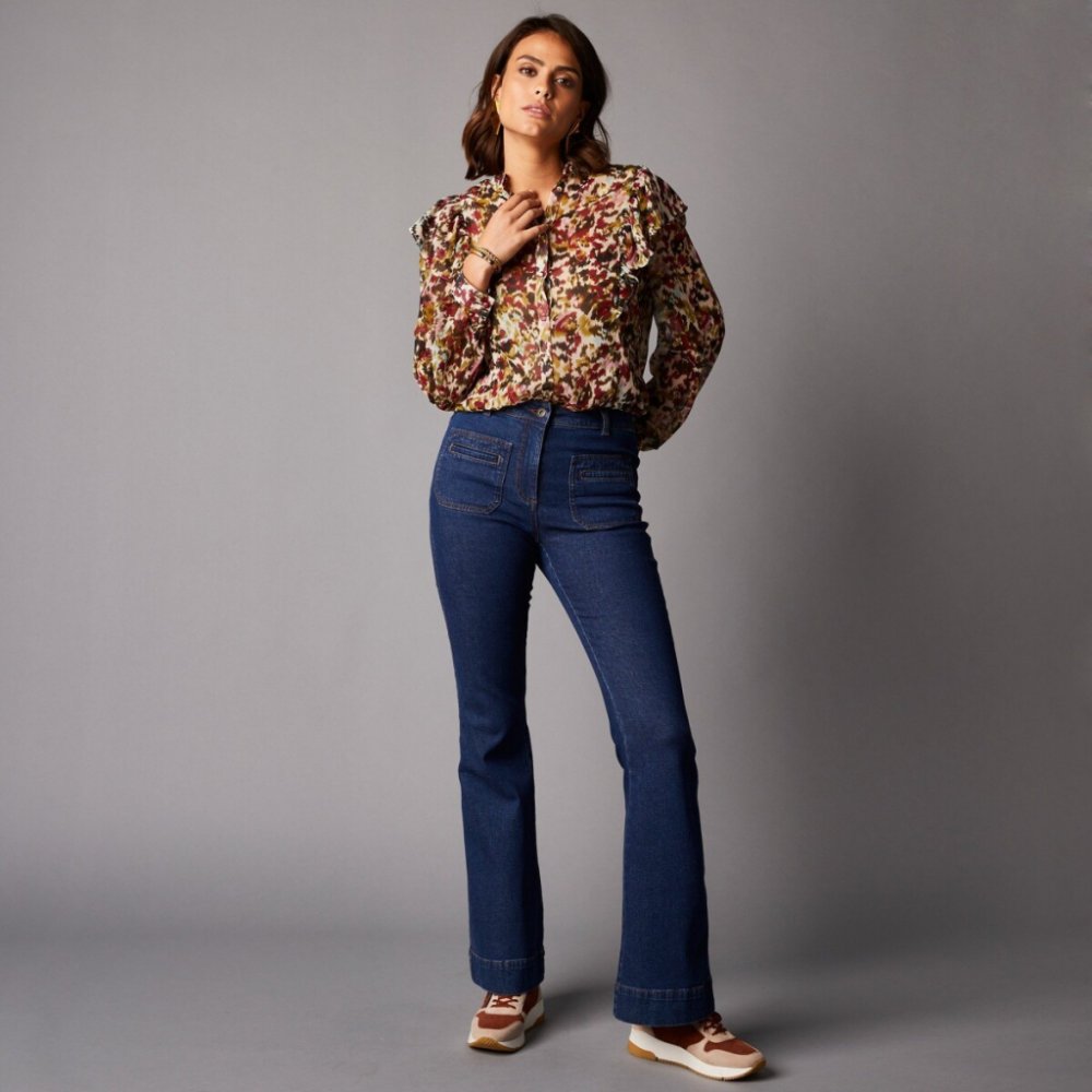Na módní scénu se vrací oblíbený zvonový střih. V kombinaci s brut denim odstínem přináší tyto krásné džíny. Módní střih do zvonu (spodní šířka nohavic 27 cm). Běžná výška pasu. Vsazený tvarovaný pas s 5 poutky a zvýšený zadní díl. Zapínání na zip + knoflík vpředu. 2 našité kapsy s paspulkou vpředu. Sepraný efekt na stehnech. 2 našité kapsy vzadu. Nohavice zakončené širokým prošitým lemem. Kontras...