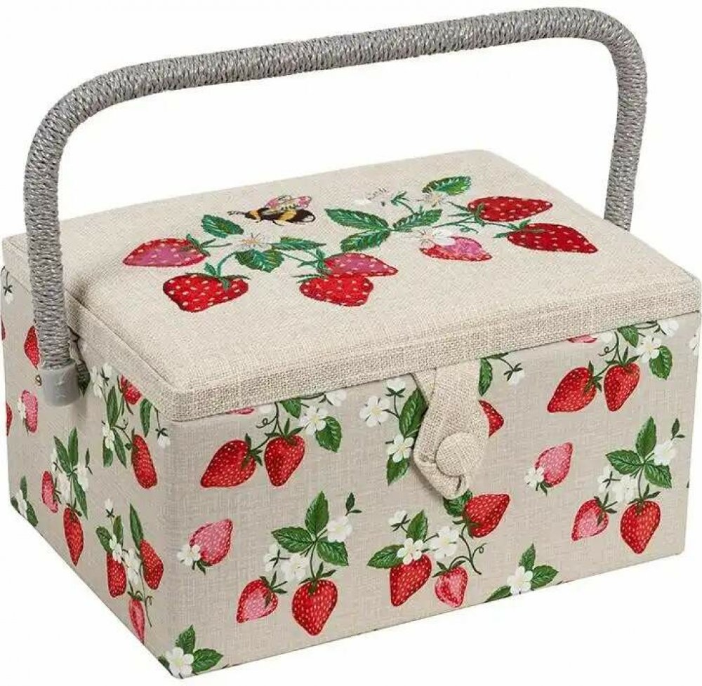 Praktický pevný košík s vyšívanými jahůdkami, kam si poskládáte vše potřebné k šití, pletení či háčkování.