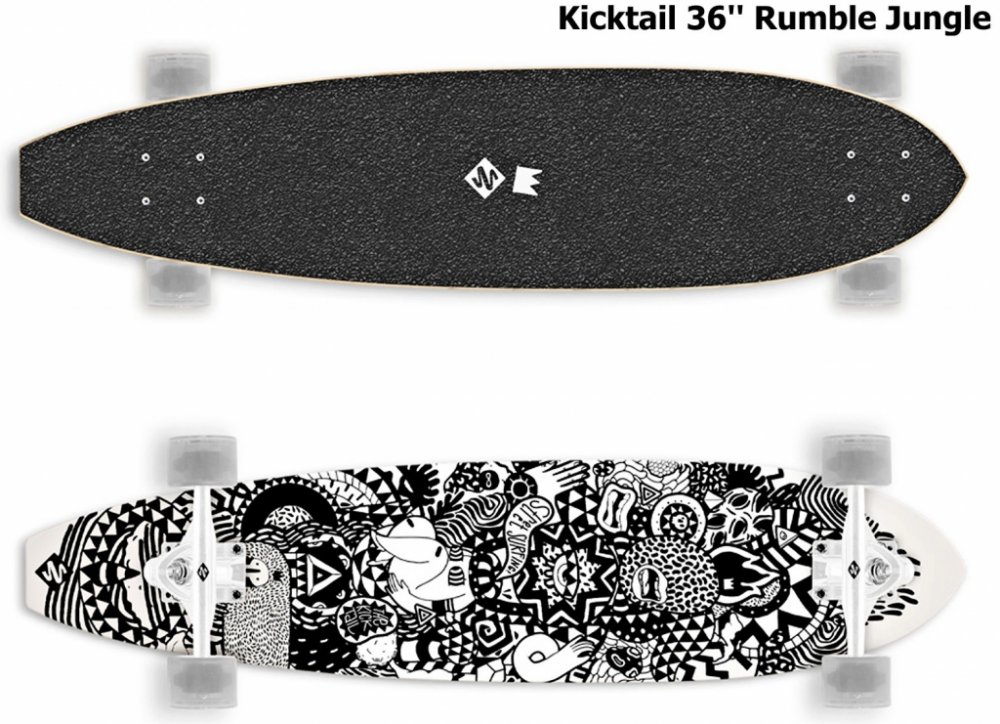 Longboard Street Surfing Cut Kicktail - Rumble Jungle 36" patří mezi longboardy typu kicktail, které jsou jsou ideální do městských ulic kvůli snadnému a rychlému ovládání. Deska je vysoce odolná, vyrobena z 8 vrstev javoru. Prostorný tvar desky umožňuje bezpečnou a vzrušující jízdu. Aluminiové trucky...