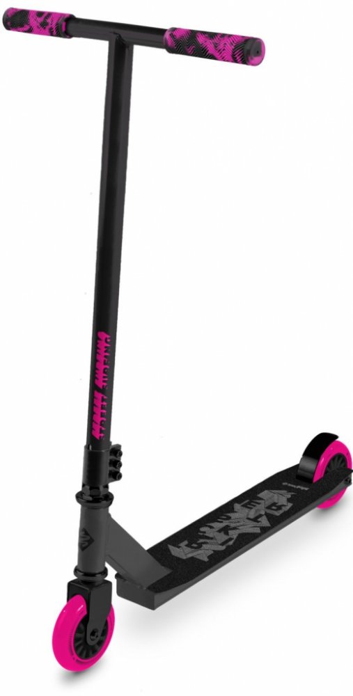 Freestyle koloběžka Street Surfing Trickster Pink Renegade je atraktivní a cenově dostupná koloběžka, na které si mohou začátečníci vyzkoušet své první skoky a triky. Bytelná konstrukce vyniká svařovanými řídítky tvaru T, ocelovou vidlicí a vyztuženou hliníkovou deskou. Měkčené rukojeti zaručují komfortní a pevné držení. Dobré jízdní vlastnosti jsou zajištěny PU kolečky o velikosti 100 mm s nylonovým jádrem a ložisky ABEC 5.
