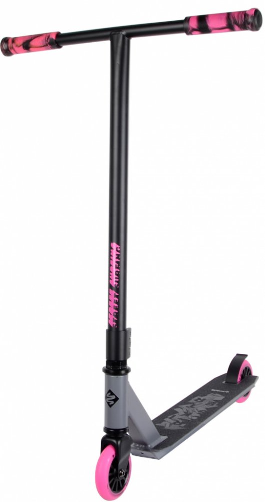 Freestyle koloběžka Street Surfing Trickster Pink Renegade je atraktivní a cenově dostupná koloběžka, na které si mohou začátečníci vyzkoušet své první skoky a triky. Bytelná konstrukce vyniká svařovanými řídítky tvaru T, ocelovou vidlicí a vyztuženou hliníkovou deskou. Měkčené rukojeti zaručují komfortní a pe...