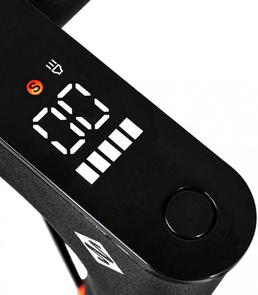Na integrovaném LCD displeji můžete sledovat základní informace o koloběžce jako je aktuální rychlost, stav baterie, indikaci připojení přes bluetooth k mobilnímu telefonu, jízdní režim v jakém se koloběžka nachází a indikaci osvětlení. Tlačítkem na horní straně displeje můžete přepínat mezi 2 jízdními režimy pro omezení max. rychlosti a zapínat osvětlení.