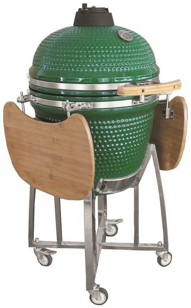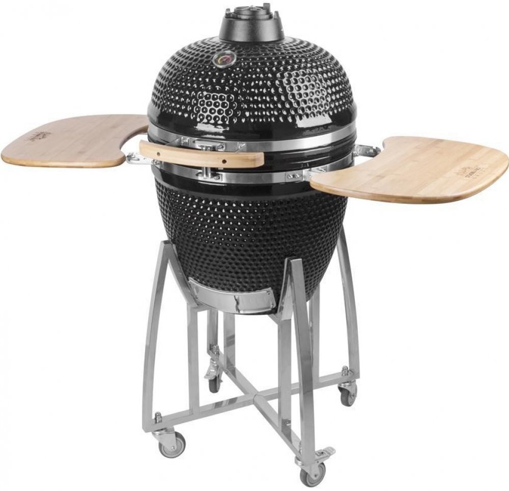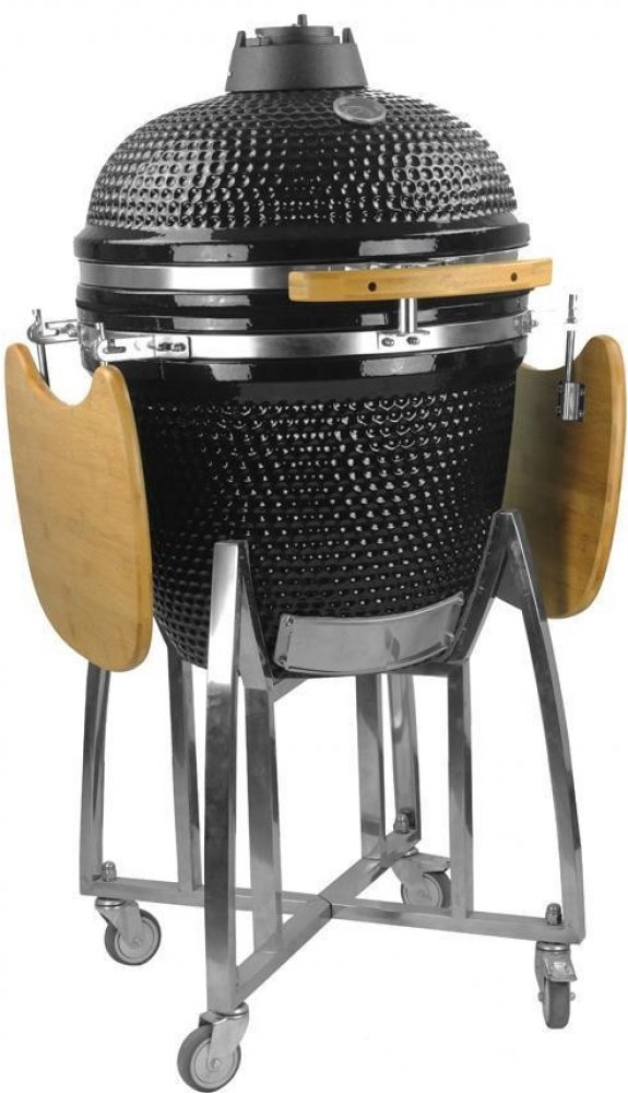 Keramický Kamado gril na dřevěné uhlí, inspirovaný japonskou troubou na rýži, nadchl v 60. letech gril mistrů po celém světě. Když ho jednou vyzkoušíte, už se ho nikdy nevzdáte, protože gril disponuje výhodami, se kterými tradiční grily soupeřit nedokážou: • 2 cm silná keramická stěna - díky ní je přijímáno teplo, rovnoměrně rozdělováno po celém nitru grilu. • Vzduchotěsné víko - gril při spotřebování extrémně malého množství paliva (až o 50% méně dřevěného uhlí než tradiční grily) dosahuje teploty v rozmezí od 110 °C do 700 °C. • Oválný tvar - díky němu se v grilu vytváří tepelný podtlak jako u normální trouby, který lze ovládat prostřednictvím posouvacího větráku na spodní straně zařízení což umožňuje používat gril nejen pro grilování , ale i pro pomalé pečení (slowcooking) nebo pro uzení . • Teploměr na víku - zobrazuje vnitřní teplou a usnadňuje její regulaci. • Materiál a forma - udržují vlhkost uvnitř, takže grilované jídlo nevyschne a zůstane vysloveně šťavnaté. • Jednoduché čištění - gril se po použití rozehřeje na 350 °C, čímž se uvnitř vypálí saze, tuk i zbytky jídel. • 2 vyklápěcí plošiny - nabízejí dostatek místa pro uložení nápojů, jídla či příboru. • Nerezový stojan - zajišťuje stabilitu grilu a je vybaven čtyřmi kolečky pro snadné přesouvání. Dvě kolečka lze zablokovat, aby se gril během používání nepohyboval. Průměr roštu 46cm.