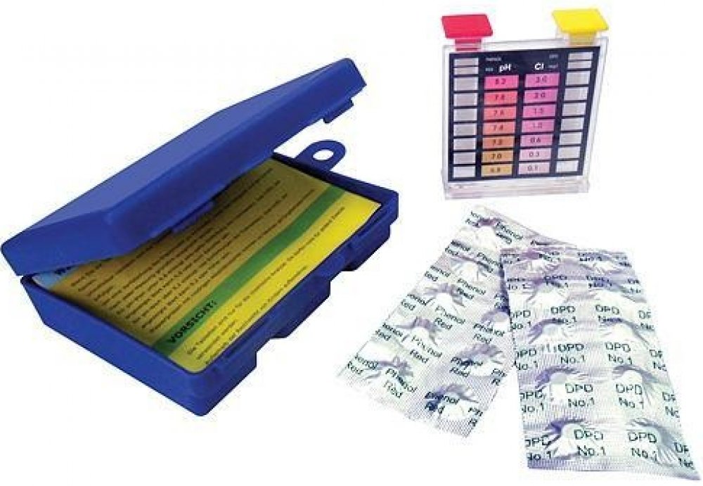 Tabletový tester pro změření koncentrace aktivního volného chloru a hodnoty pH bazénové vody.Balení obsahuje:- 10 tablet zatavených v hliníkové fóliiTestovací nádobky jsou vyrobeny z průhledného plastu a spojeny do jednoho kusu dvěma spojovacími destičkami s porovnávacími barevnými stupnicemi. Rozsah stanovení hodnoty pH v intervalu 6,8-8,2, koncentrace volného chlóru od 0,1,-3.0.mg/l.Testovací nádobky jsou barevně odlišeny:- pH-červená- chlór – žlutáCelý tester je uložen v plastovém boxu, dobře uzavíratelném, takže je chráněn před vlivy okolního prostředí a poškození. Návod k provedení stanovení:Testovací nádobu naplňte bazénovou vodou po rysku (2 rysky u chlóru). Tabletu vyjměte z hliníkového obalu a dejte ji do testovací nádoby se vzorkem vody. Nádobu na testování uzavřete víkem a trochu promíchejte, aby se tableta celá rozpustila.Poté ihned srovnejte zabarvení vzorku s příslušnou barevnou stupnicí na plastové destičce v blízké vzdálenosti testovací nádoby. Po ukončení měření nechte tester dobře vyschnout a poté uložte zpět do plastového boxu mimo působení slunečních paprsků.
