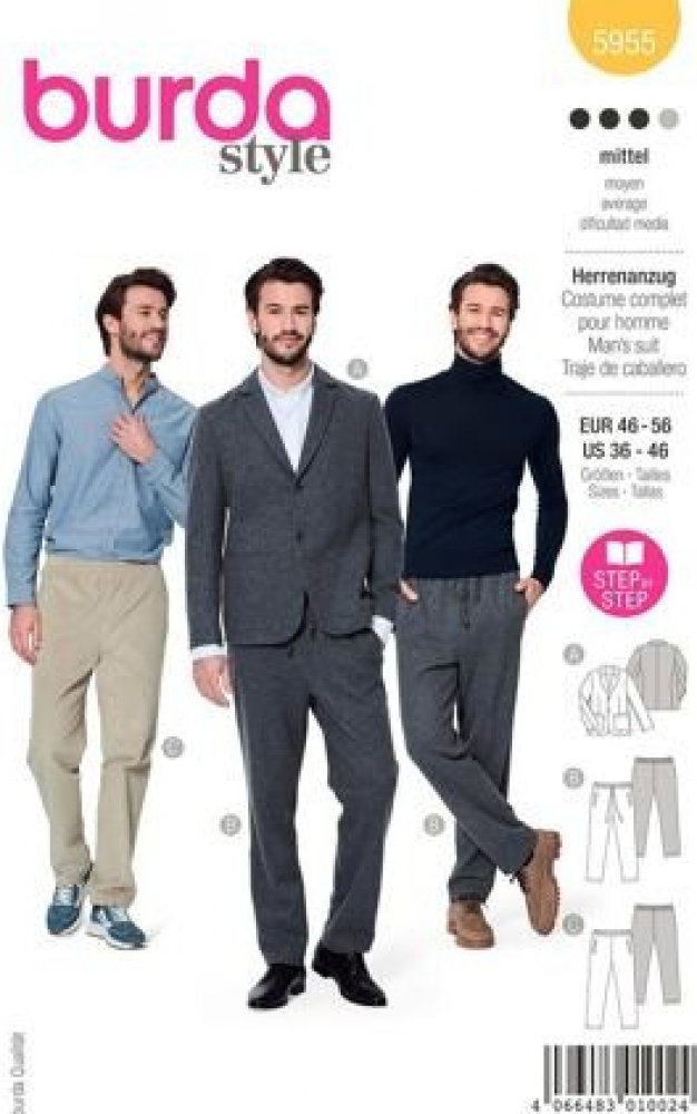 Střih Burda zelený 5955 - pánský ležérní oblek, sako, teplákové kalhoty, je soubor střihů pro ušití pánského obleku, saka, kalhot. Střihy jsou natištěné na kvalitním křídovém papíru. Soubor obsahuje střihy pro ušití pánského oblečení. Díky jednoduchému střihu, podle kterého zvládnou šít i začátečníci, získáte originální modely pro pánský šatník. Střih je ve velikostech EUR 46-46. Pokud chcete střihy dále používat, je doporučeno si je překreslit. Potřebné pomůcky naleznete i v našem obchodě. Úroveň obtížnosti: střední Doporučené látky: směsové látky, manšestr, teplákovina Ke střihům Burda je poskytován tištěný obecný návod pro práci se střihy v českém jazyce. Podrobnější návod pro práci se střihem je obrázkový s cizojazyčným popisem.