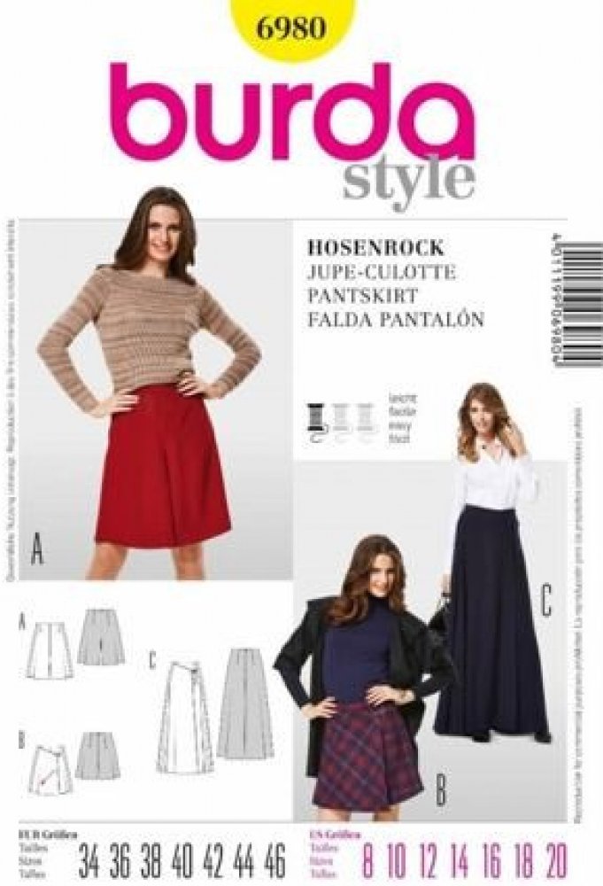 Střih Burda žlutý 6980 - dámská zavinovací kalhotová sukně, culottes je soubor střihů pro ušití dámské zavinovací kalhotové sukně a culottes. Střihy jsou natištěné na kvalitním křídovém papíru. Soubor obsahuje střihy pro ušití dámské zavinovací kalhotové sukně a culottes. Díky jednoduchému střihu, podle kterého zvládnou šít i začátečníci, získáte originální modely pro Váš šatník. Rozšiřte si svůj šatník o originální vlastnoručně ušité kousky. Cullotes (z francouštiny, čte se [kylɔt] ) jsou široké pohodlné kalhoty, zkrácené nad kotníky. Střihy jsou s přídavky na švy ve velikosti 34 - 46. Pokud chcete střihy dále používat, je doporučeno si je překreslit. Potřebné pomůcky naleznete i v našem obchodě. Úroveň obtížnosti: lehká Velikosti: 34 - 46 Doporučené látky: lehčí vlněné látky, krepové látky, bavlna Ke střihům Burda je poskytován tištěný obecný návod pro práci se střihy v českém jazyce. Podrobnější návod pro práci se střihem je obrázkový s cizojazyčným popisem.