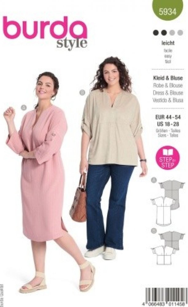 Střih Burda 5934 na dámské šaty a halenku pro plnoštílhé ve dvojím provedení