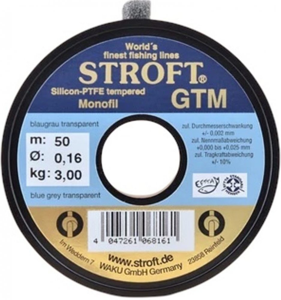 STROFT GTM je monofilní vlasec šedo-modré barvy z vysoce kvalitního kopolymeru. Je vysoce odolný vůči změně počasí a slané vodě, což se zásadně projevuje na životnosti vlasce.GTM je vláčný, velmi odolný proti oděru s nízkou průtažností a nulovou tvarovou pamětí.Doporučuje ho pro kaprovou techniku, plavačku, muškařinu i přívlač. Dle výsledků provedeného testu Mnichovským výzkumným institutem na kvalitu monofilnich vlasců dodávaných výrobci na trh vyhodnocen s velkým předstihem jako absolutní vítěz č.1na světě.