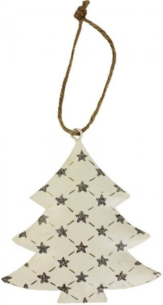 Dekorativní stromeček k zavěšení. Rozměry : 8,5 x 1,2 cm, výška 9,5 cm.    Barva : bílá se stříbrnými hvězdičkami. Materiál : kov.