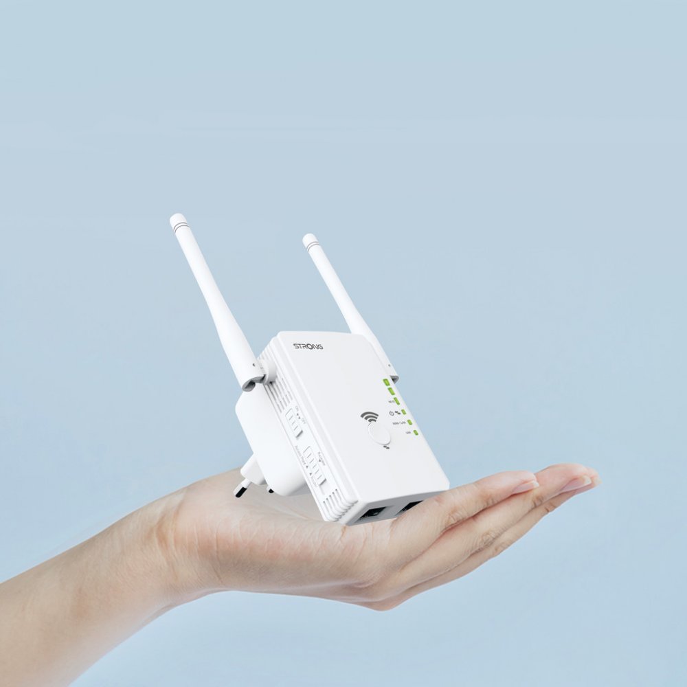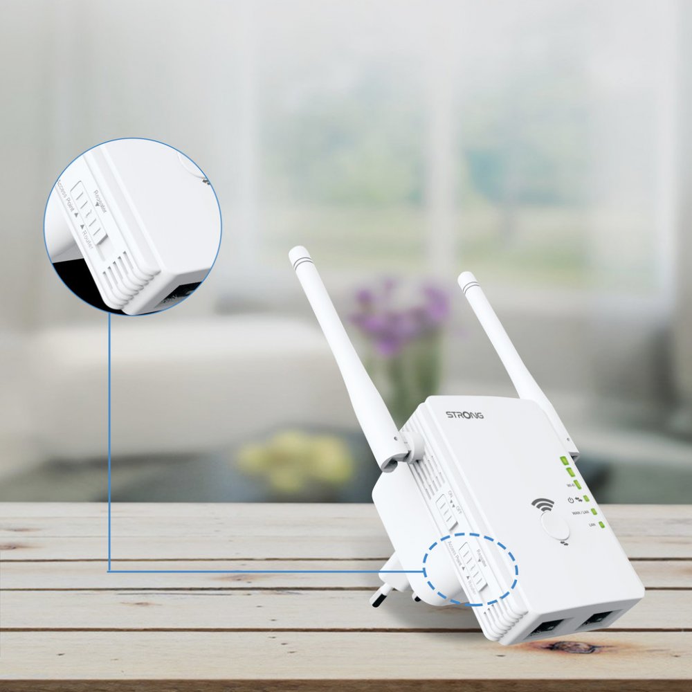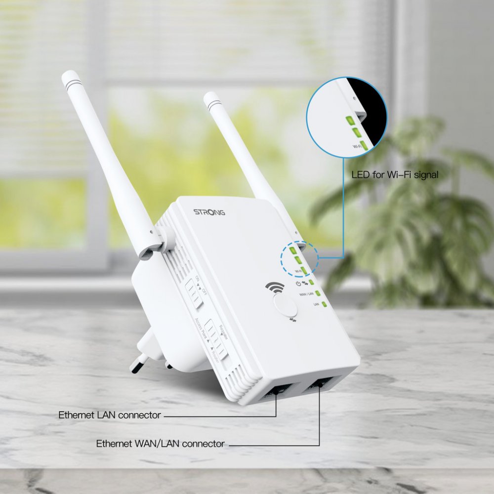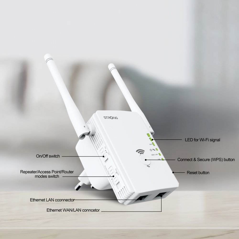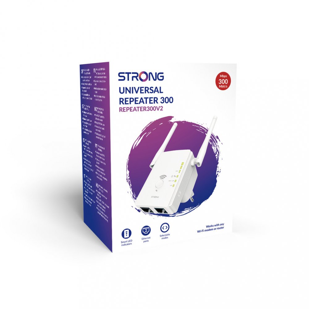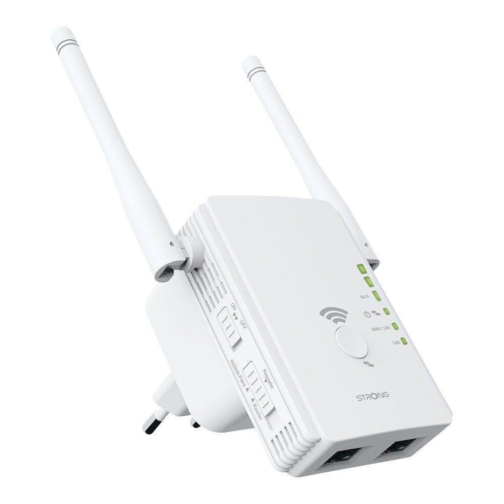 STRONG univerzální zesilovač 300/Wi-Fi standard 80 Access point, repeater, router, Wi-Fi, standard 802.11n, 300 Mbit/s, 2,4GHz, 2x LAN, bílý