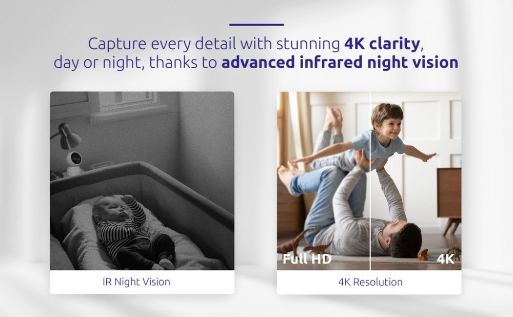 Vnitřní IP kamera se snímačem 1/2,7" CMOS nabízí snímání videa v rozlišení 3840 × 2160 obrazových bodů. Pro případ zhoršených světelných podmínek je přítomen IR přísvit. Součástí kamery je integrovaný reproduktor a mikrofon, který umožní kvalitní oboustrannou komunikaci. Připojení lze jednoduše realizovat bezdrátově skrze Wi-Fi. Propojení kamery pomocí aplikace v mobilním zařízení umožní pohodlný vzdálený přístup, pořizování záznamů či fotografií nebo upozornění v případě detekce pohybu. Natočené záznamy je možné ukládat na microSD kartu do kapacity až 512 GB, nebo odesílat na cloudové úložiště (na základě předplatného). Přímo v aplikaci navíc můžete s kamerou pohodlně otáčet o až 360°.