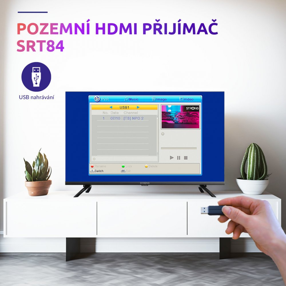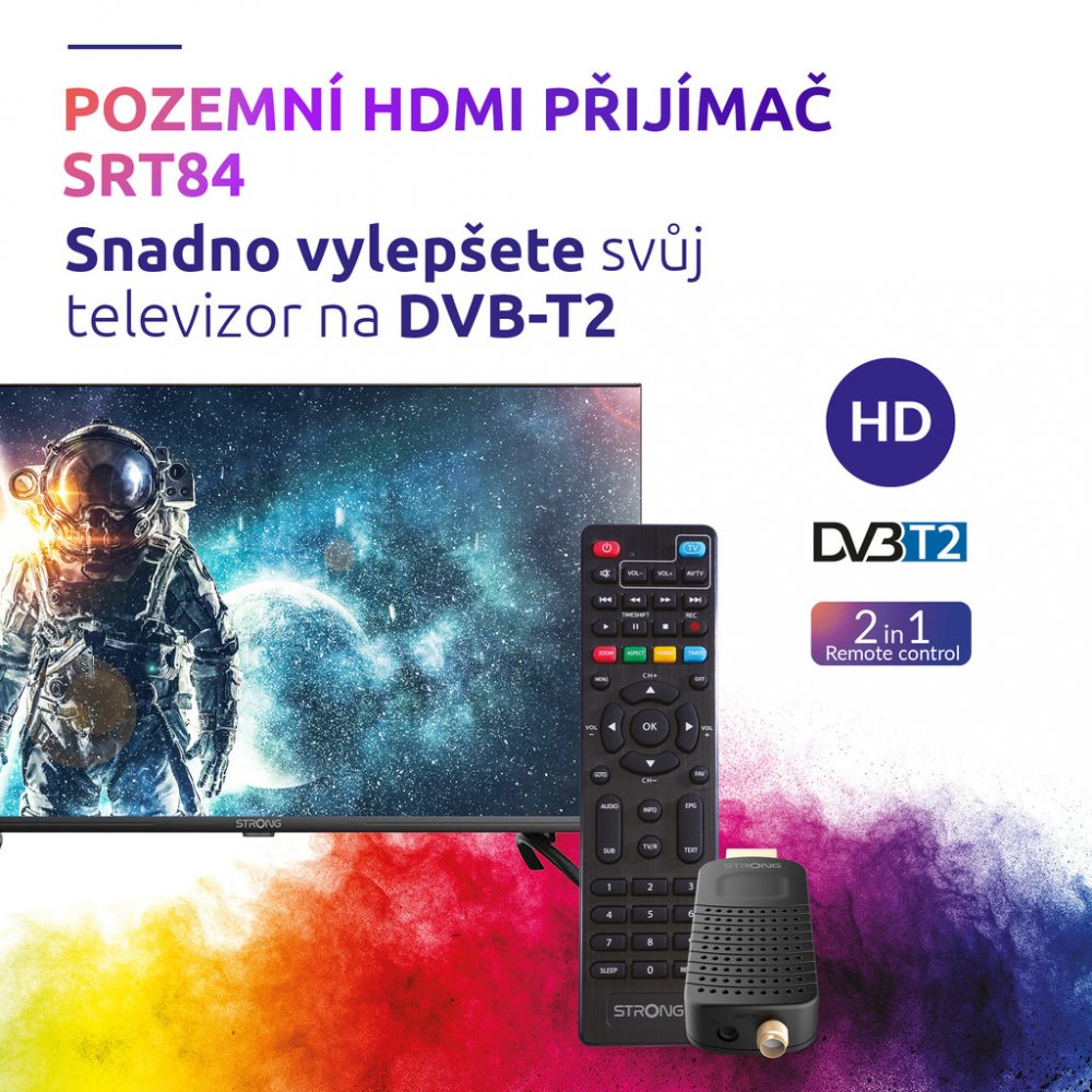 TV tuner pro upgrade vašeho televizoru s vestavěným DVB-T tunerem na nové vysílání DVB-T2 s kodekem H.265. Zařízení stačí připojit k televizoru skrze HDMI konektor a díky malým rozměrům jej tak i snadno schovat. Ovládání je pak snadné díky přiloženému 2 v 1 dálkovému ovladači, který umožňuje ovládat TV tuner i televizor. Zařízení nabízí paměťovou kapacitu až 400 kanálů, 8 seznamů oblíbených kanálů nebo dokonce až 8 časovačů událostí se 3 režimy (jednorázový, denní, týdenní). Potěší také elektronický průvodce programy (EPG) či možnost nahrávání pořadů na externí USB úložiště. Výhodou zařízení je také napájení z USB televizoru, neobsazuje tak další zástrčku.