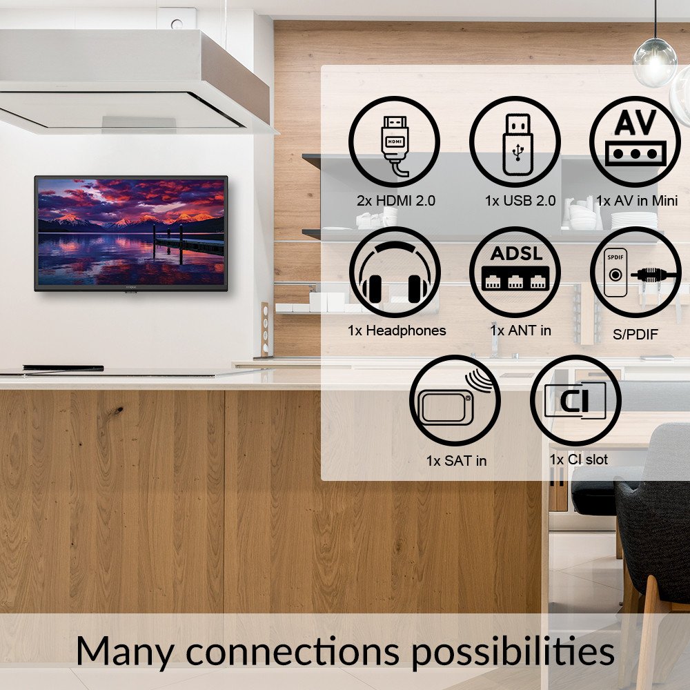 LED televizor nabízí úhlopříčku 24" a HD rozlišení 1366 × 768 obrazových bodů. Pro příjem televizního vysílání je připraven DVB-T2/S2/C tuner s podporou dekódování H.265/ HEVC. Pro přehrávání multimédií je možné využít USB port a o zvuk se starají integrované reproduktory s celkovým výkonem 4 W. K dispozici je také hotelový mód, který neumožňuje změnu nastavení bez přístupovéh...