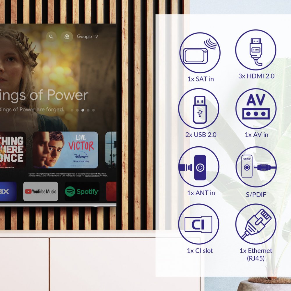 Vestavěný DVB-T2/C/S2 tuner pro příjem nekódovaných televizních a rozhlasových kanálů prostřednictvím antény