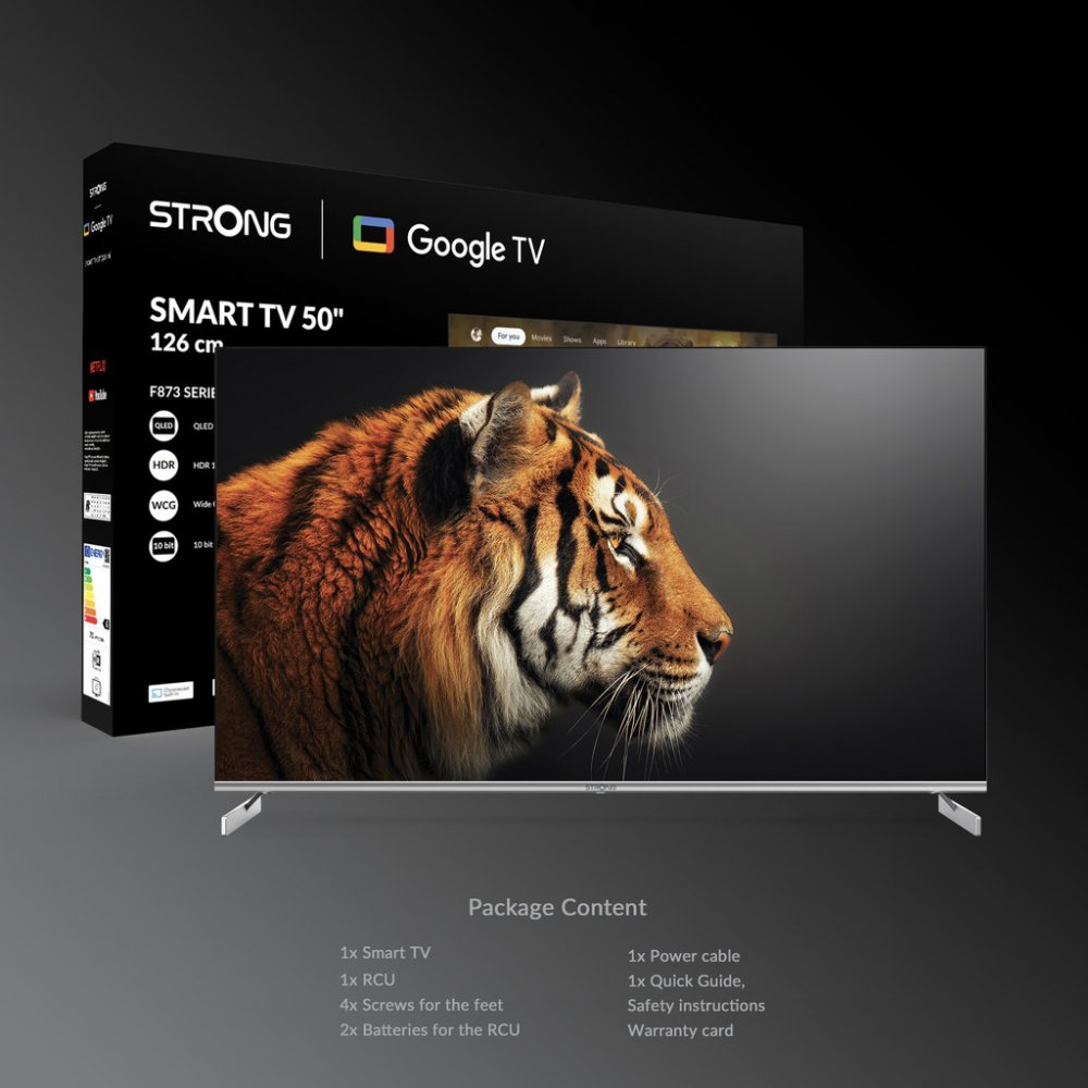 Strong 125.73 cm QLED 50 palců Google TV (Android 11) 2024 Stříbrná Dálkový ovladač, manuál, napájecí kabel, sada pro montáž Dobré pro smíšené osvětlení 6.5 ms 3840 x 2160 16 : 9 60 8 bit 1.5-2.5m optimální Standardní podpora HDR 4K HDR streaming ready 3 2 3 porty (3× plná rychlost 48Gbps) Snadná montáž (standardní VESA) 9.7 kg 200 x 200 Vyžaduje 120cm+ nábytek 111.12×64.19×8.96 G 71 kWh 71 kWh 1781932 Dobrý vestavěný zvuk