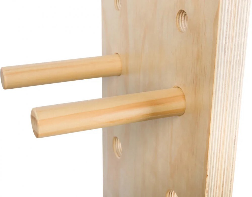 Lezecká stěna je vybavena otvory, do kterých postupně zasouváte 2 dřevěné kolíky. Kolíky mají průměr 3 cm. To je ideální průměr pro pevný stisk. Kolíky vám budou perfektně držet v ruce a vy tak můžete ze sebe vydat maximum.