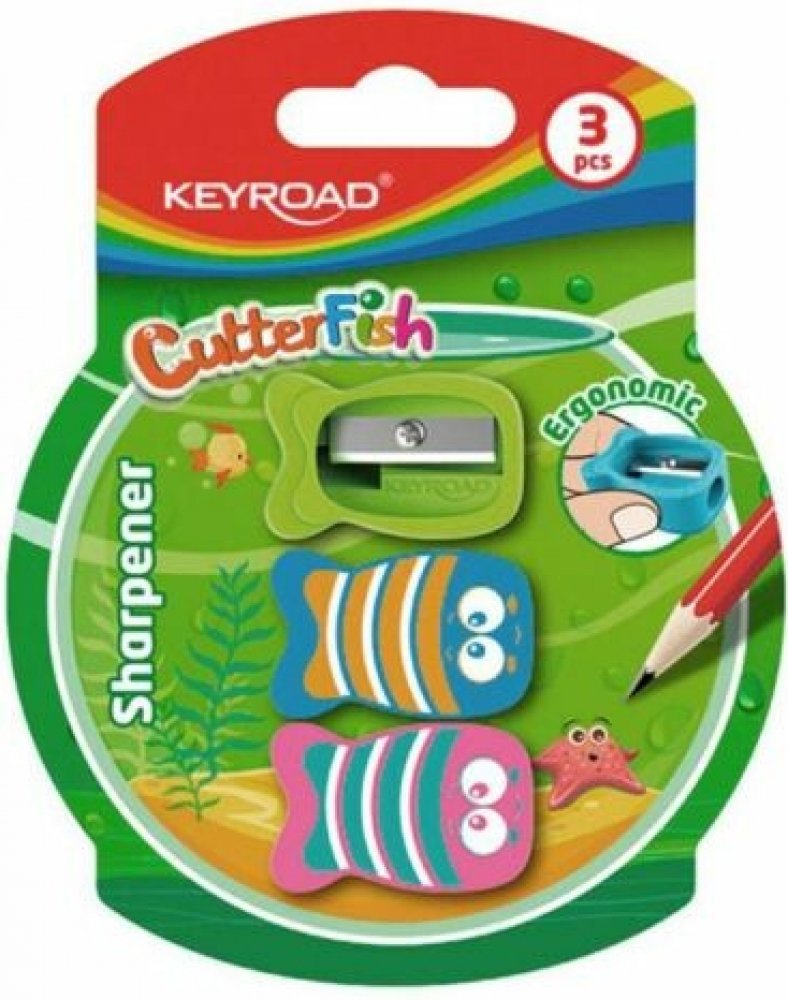 Souprava obsahuje tři samostatná struhadla KEYROAD ve tvaru ryby s otvory na tužku/pastelku o průměru 8 mm.