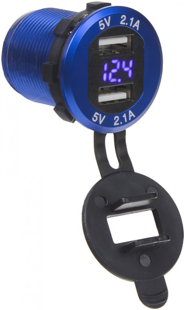 2x USB nabíječka s voltmetrem, hliníková do panelu, s krytkou proti prachu a vlhkosti, modrá.
